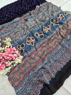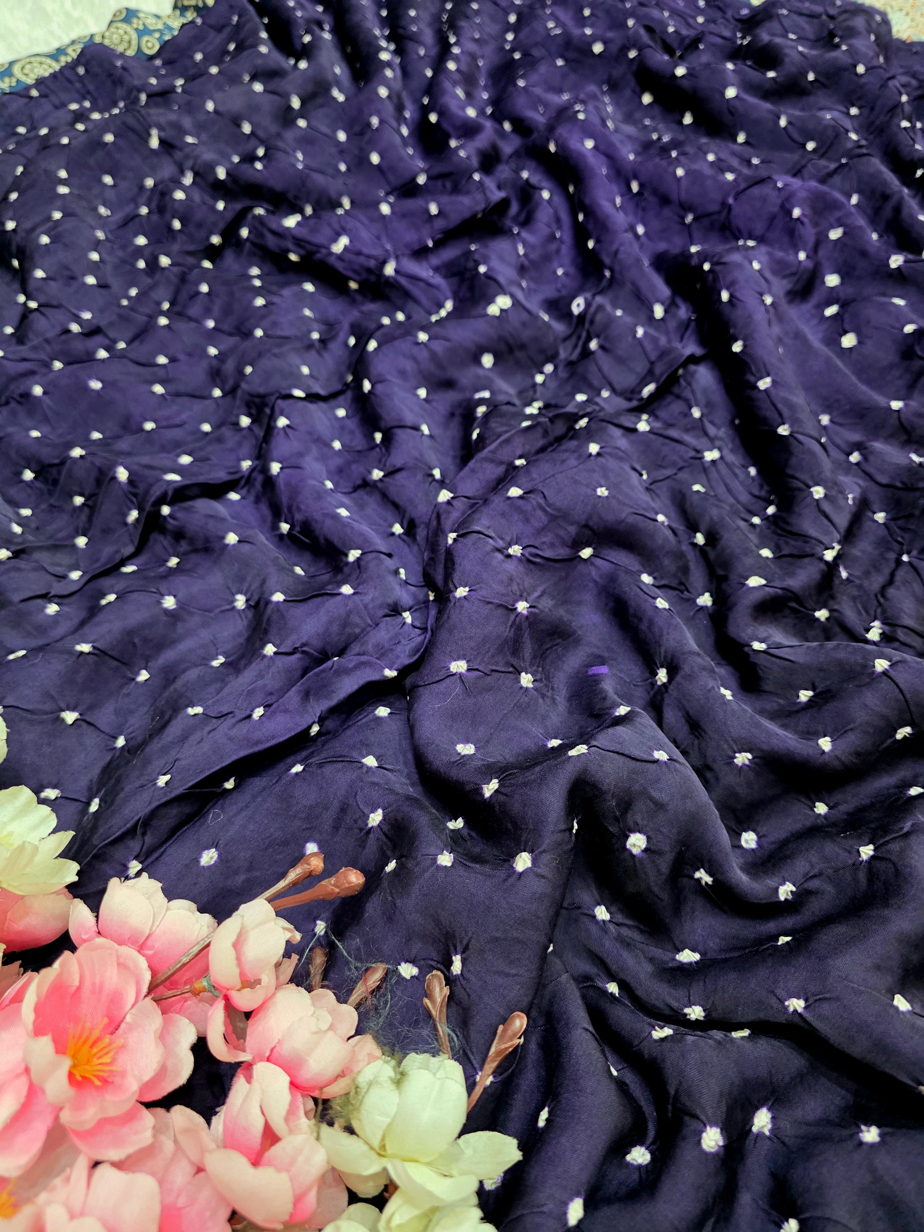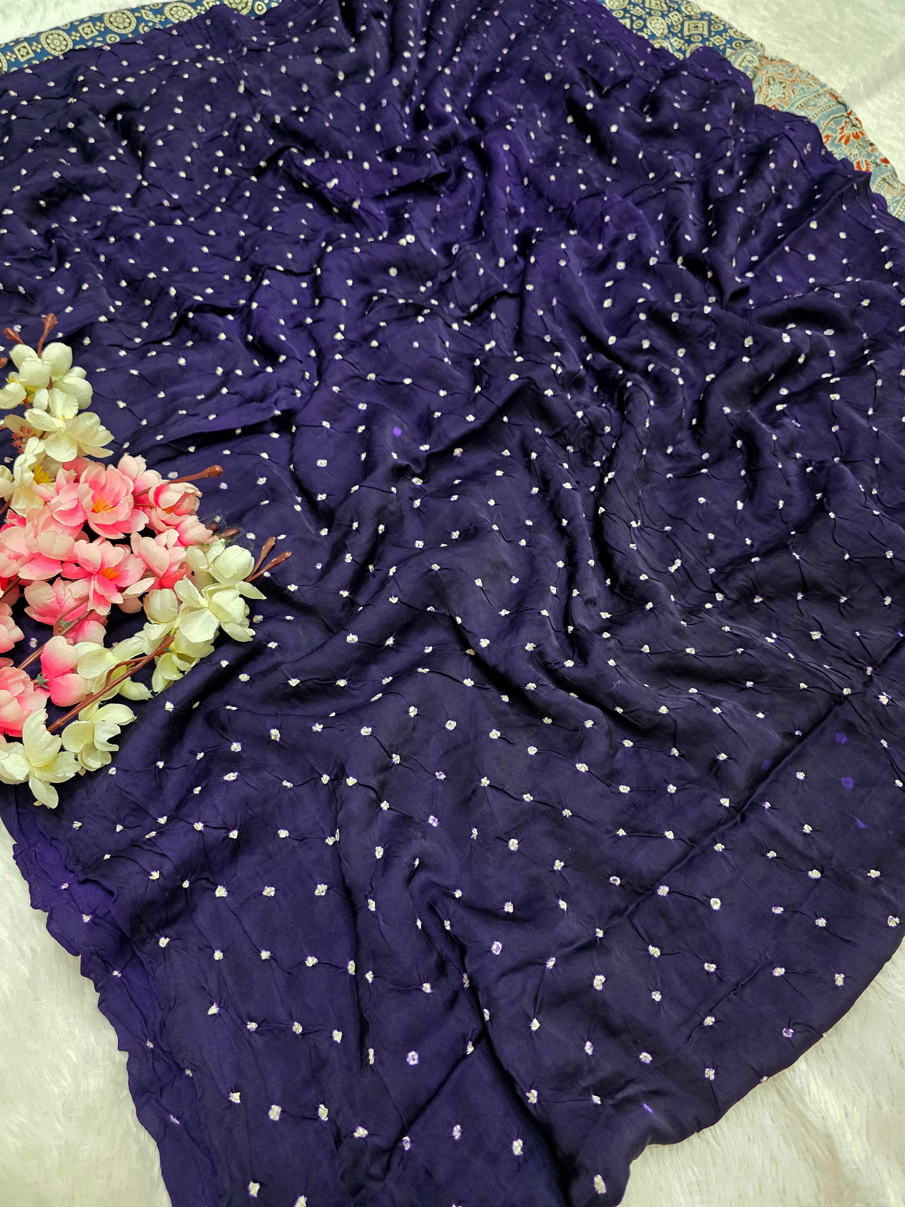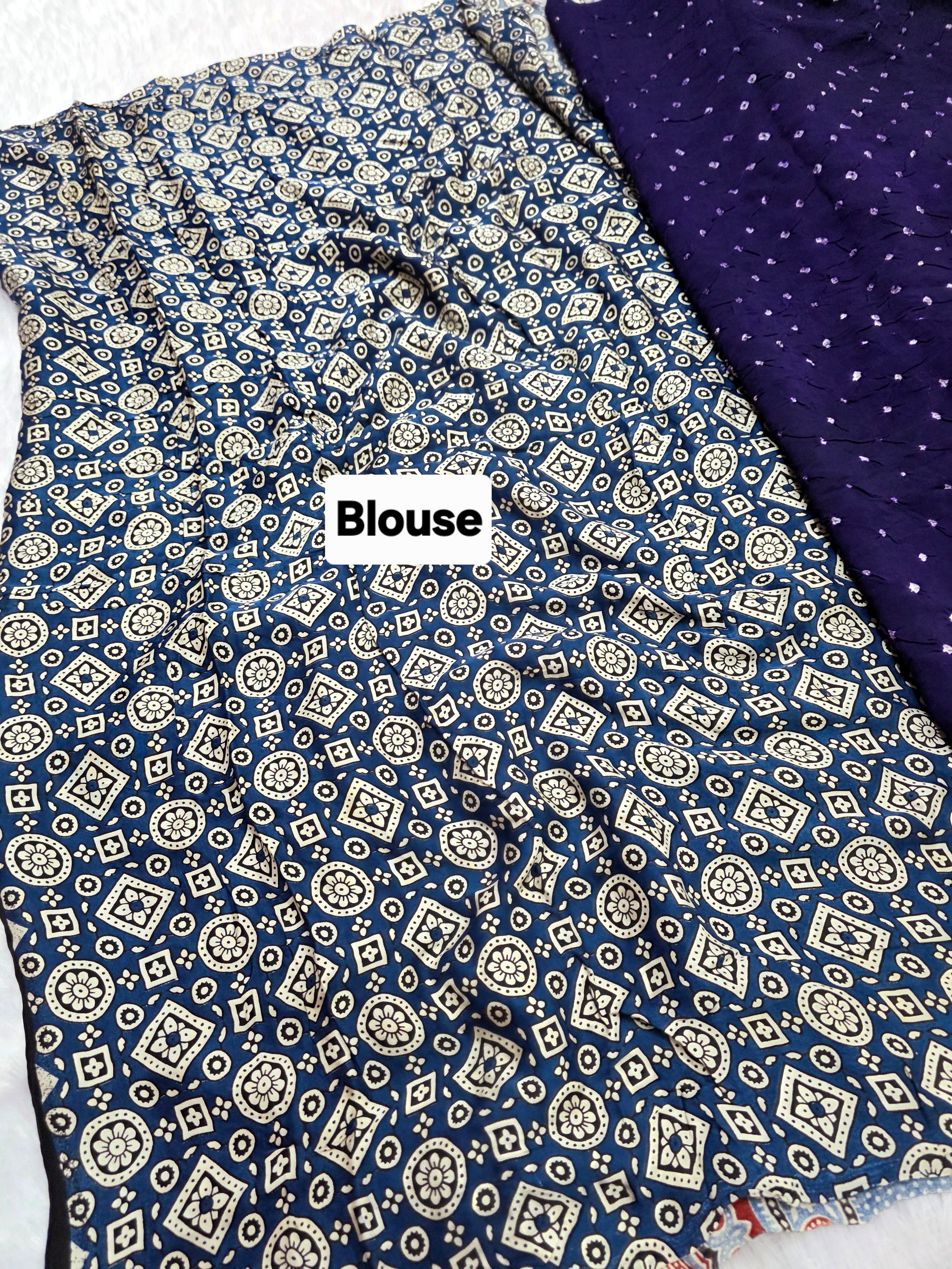 143001 Modal Silk Ajrakh Saree with Hand Bandhani - Brinjal Blue