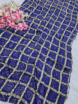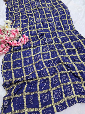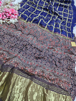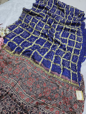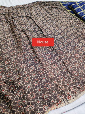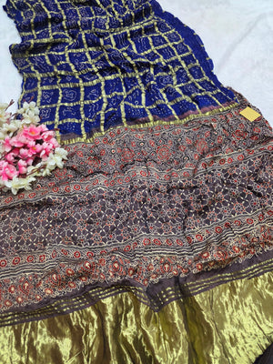 143005 Modal Silk Ajrakh Saree With Zari Checks and Bandhnai