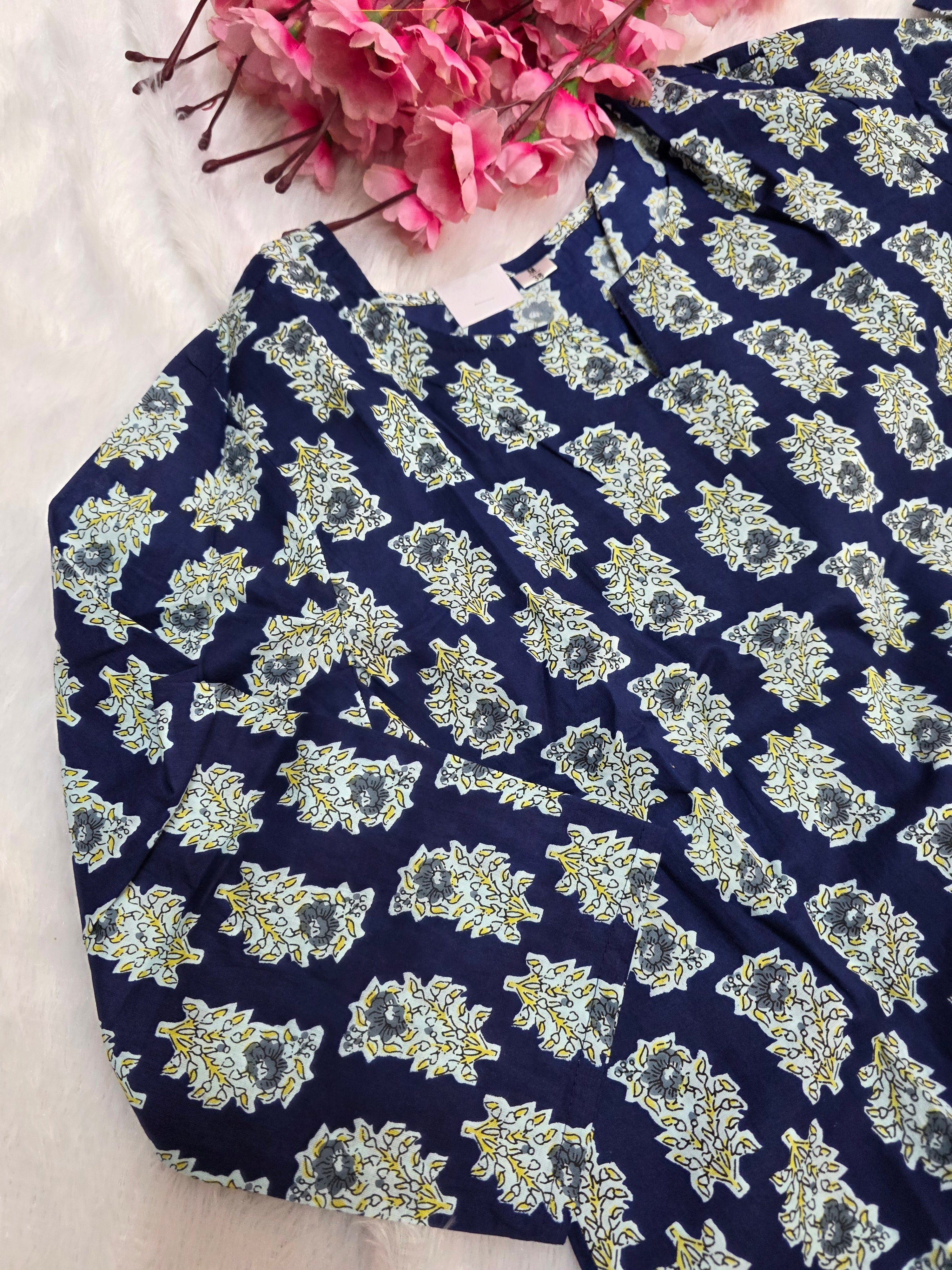 1758 Pure Cotton Hand Block Printed Shot Kurtis (Blue)