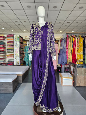 It has a Round-neck, Full sleeves blouse Comes with a beautiful draped saree.