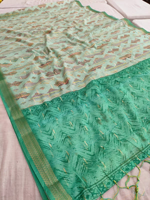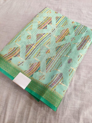422007 Designer Soft Linen Digital Printed Saree with Zari Weaving - Green