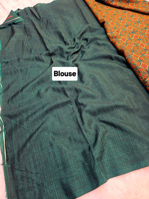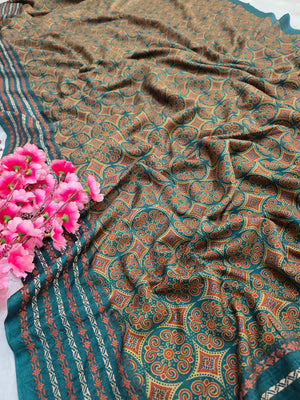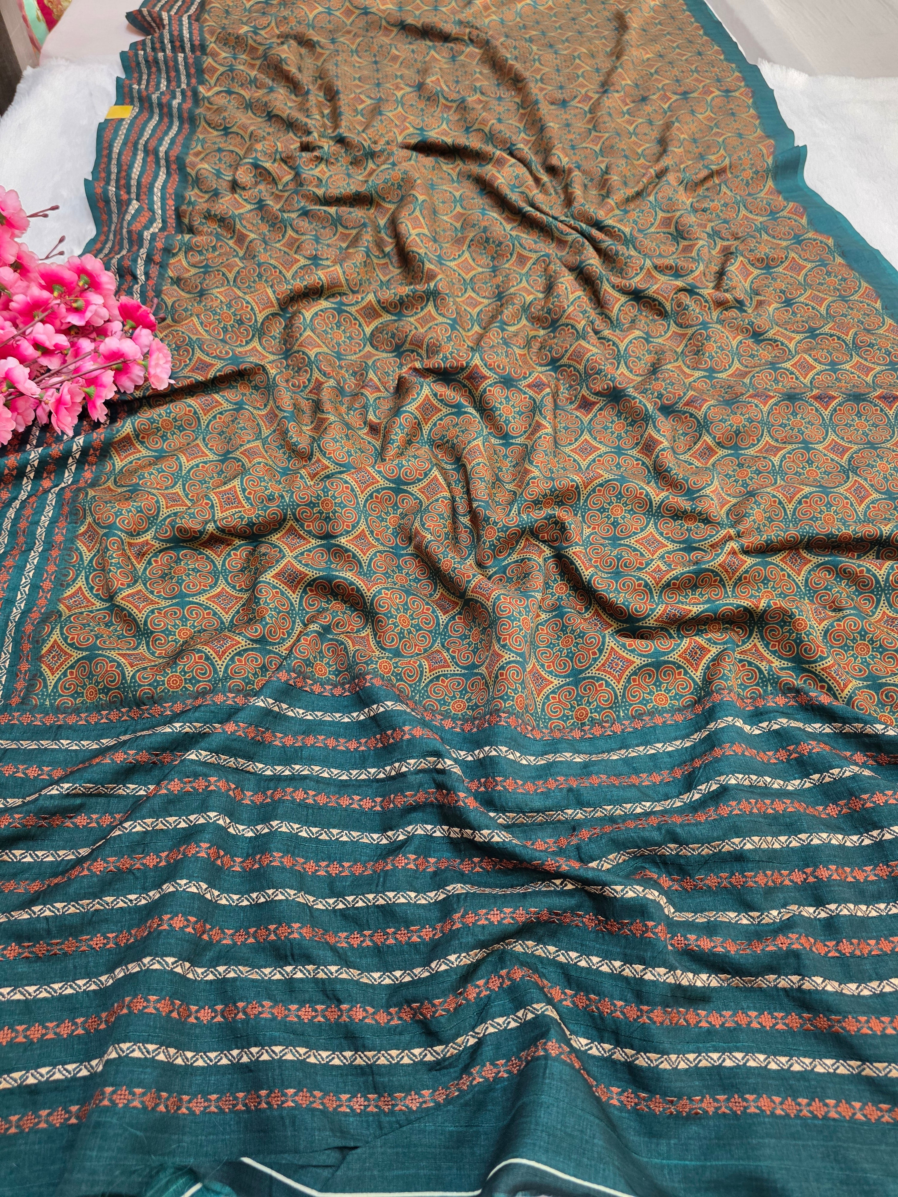 459006 Semi Silk Ajrakh Print Saree With Embroidery - Green