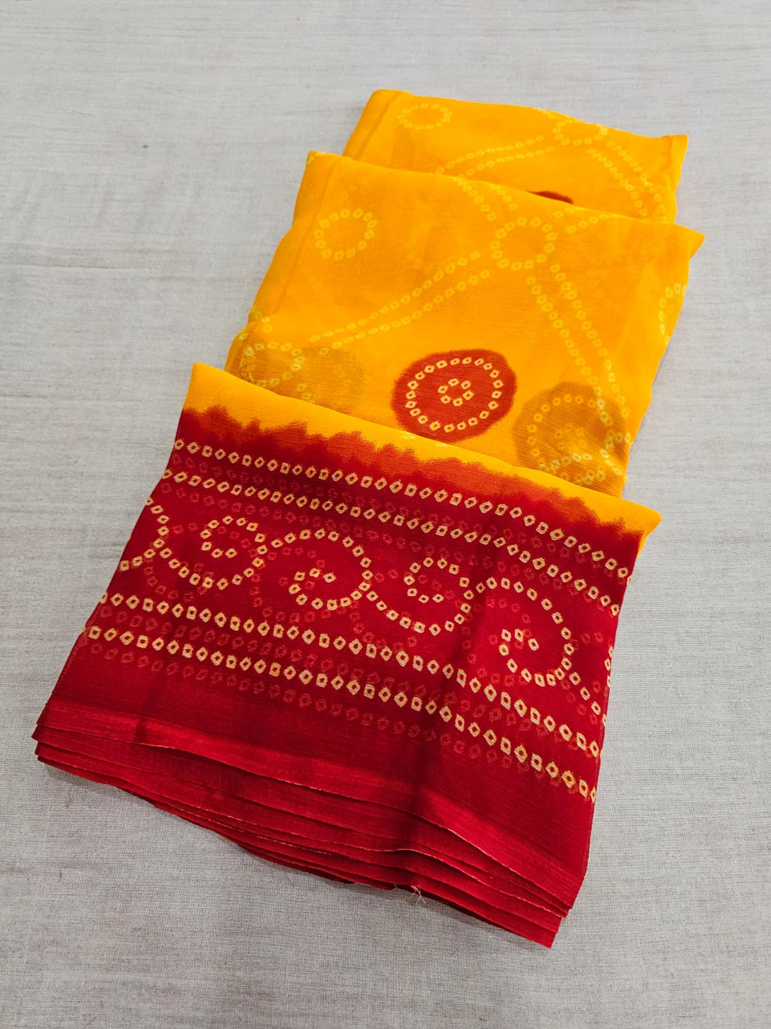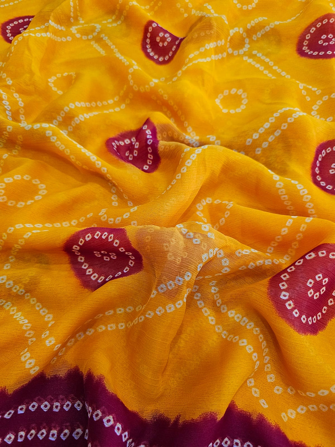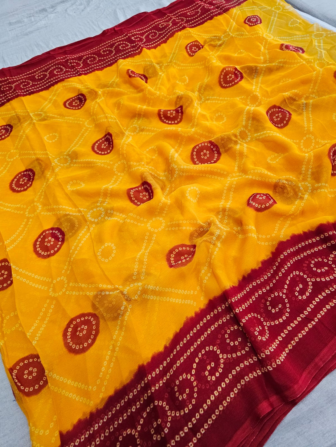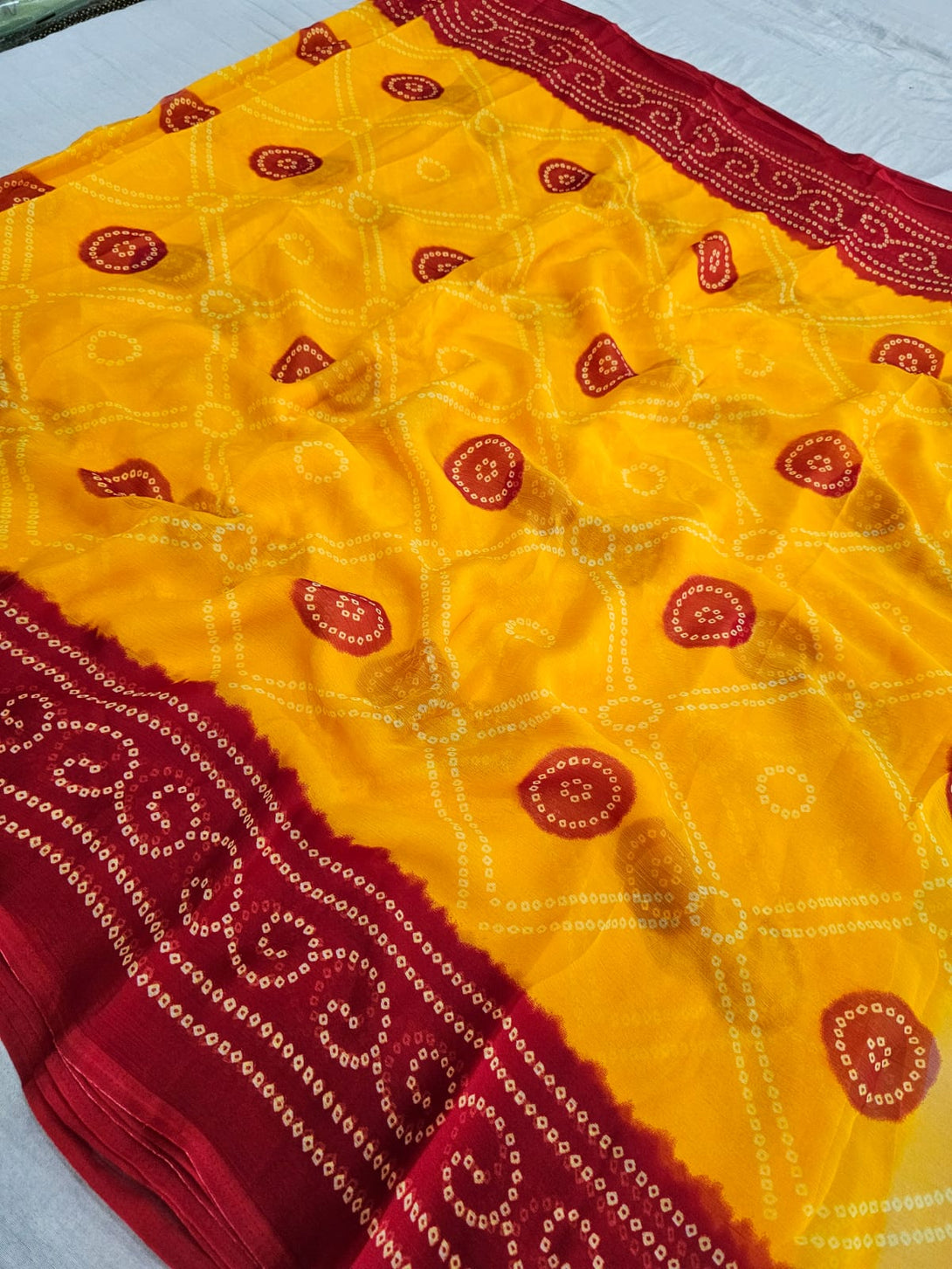 664001 Exclusive Chiffon Bandhej Print Saree - YELLOW RED