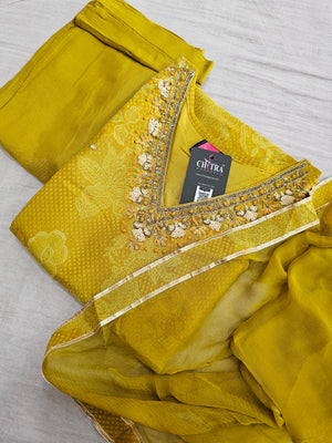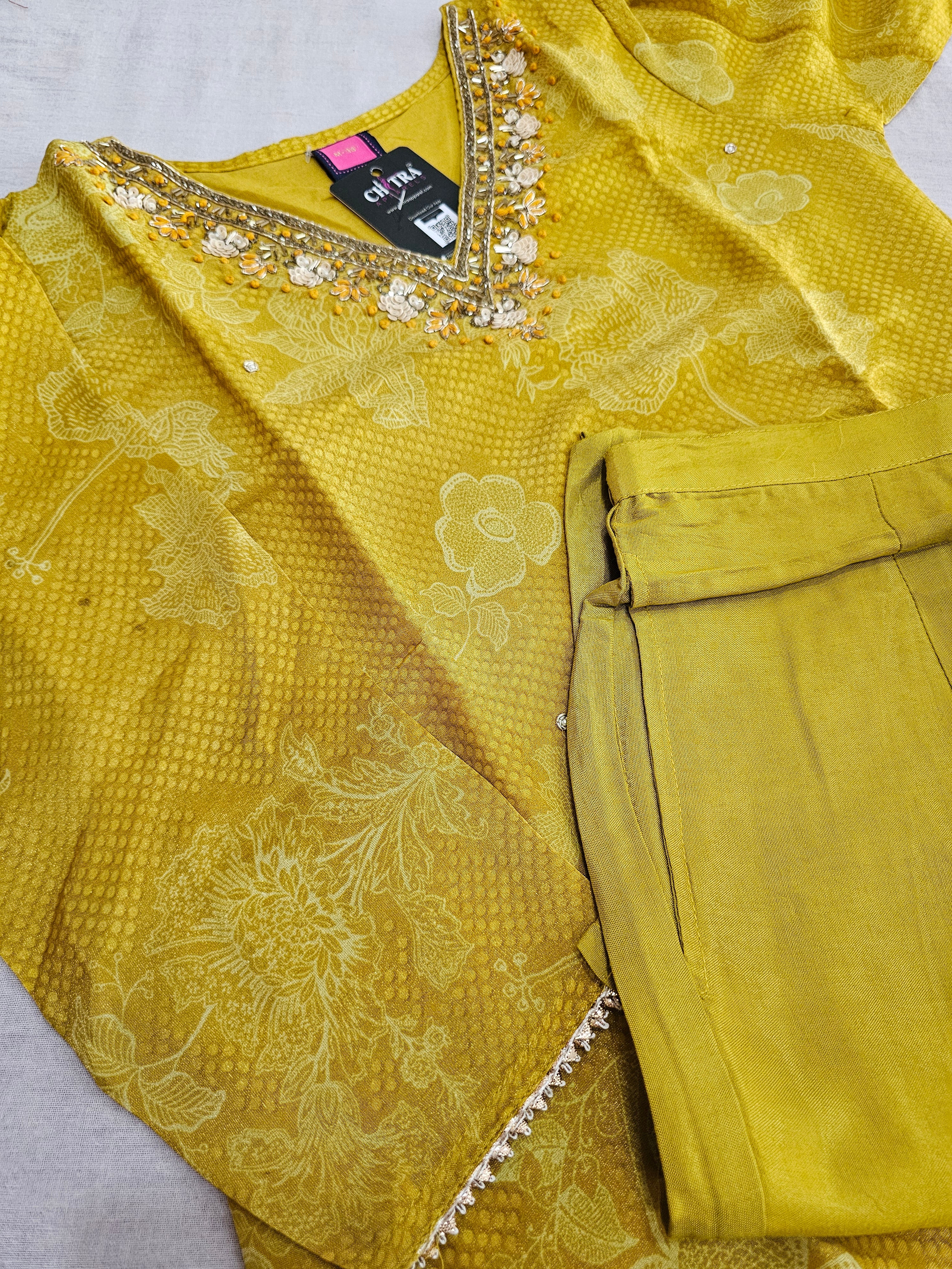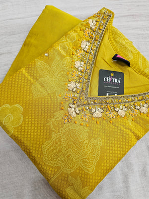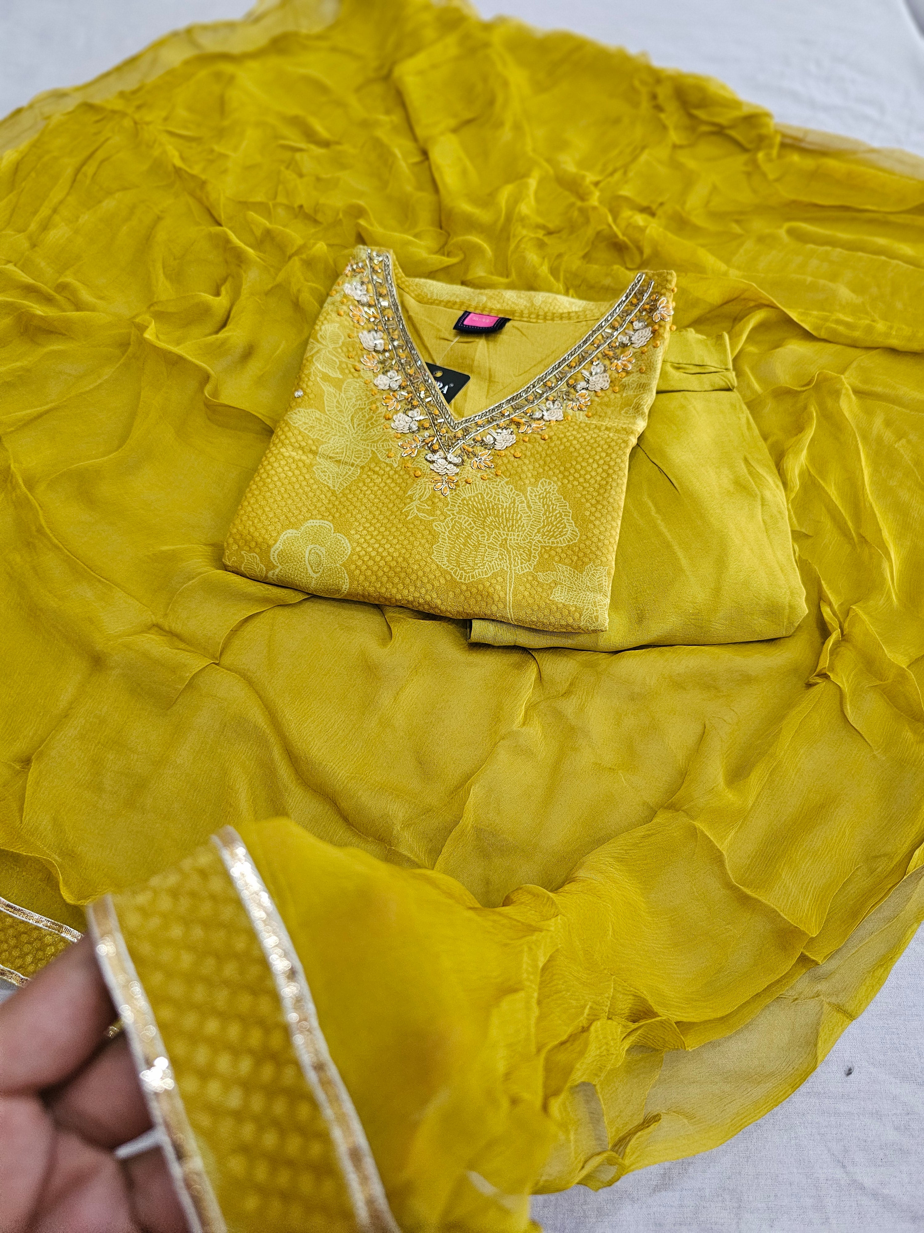 - Highlight : Pure Tissue Silk Handwork Kurti Set With Pant and Chiffon Dupatta