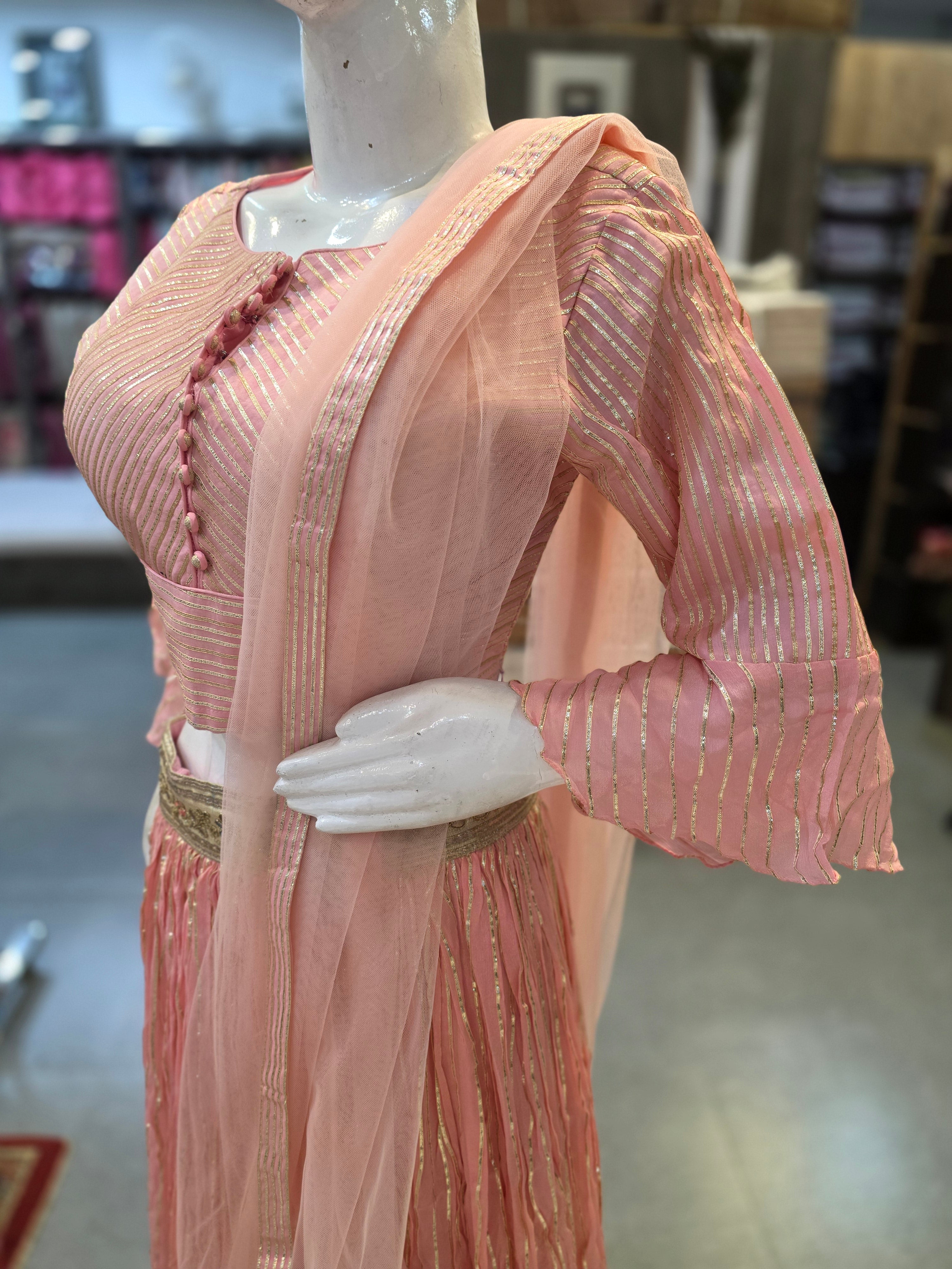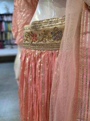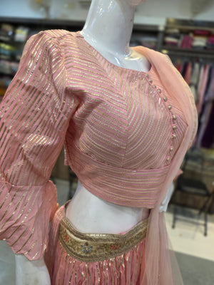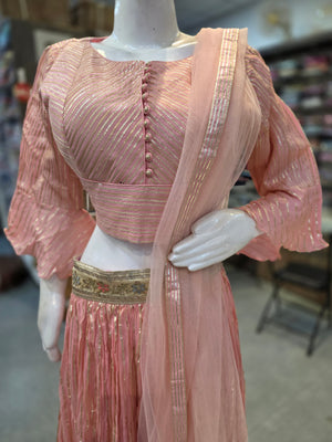 Make a grand style statement with this Pure Chinon Silk stitched Lehenga, beautifully designed with Gotapatti work. It comes with a heavy Gotapatti work stitched blouse and an elegant 2.5 mtr Soft Net dupatta, perfect for weddings and festive occasions.