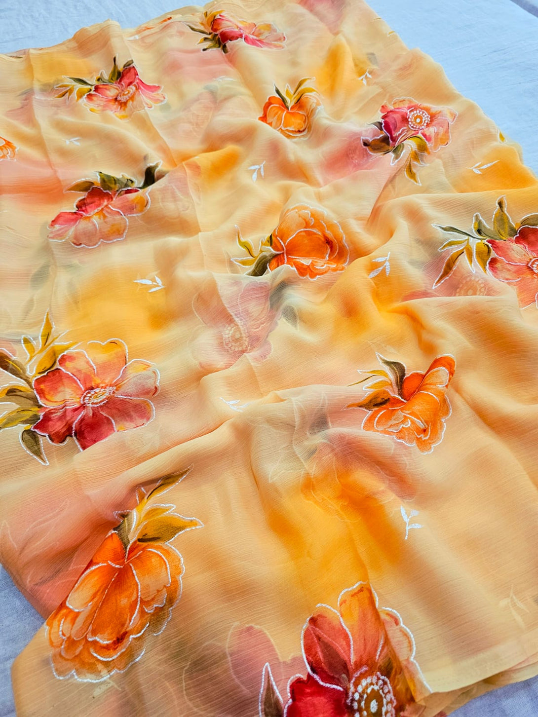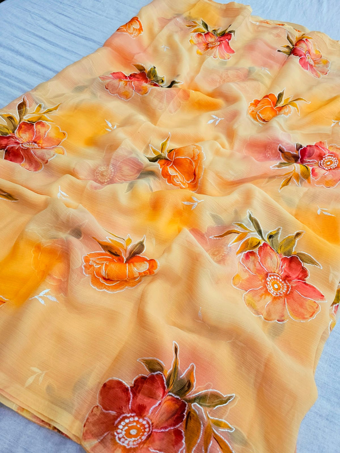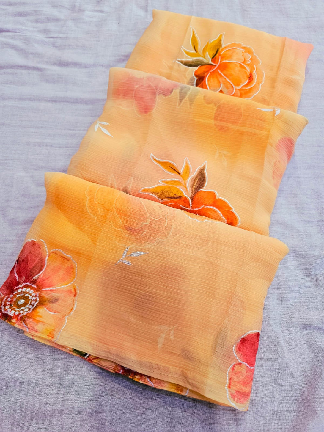 702004 Heavy Chiffon Flower Print Saree - Peach
