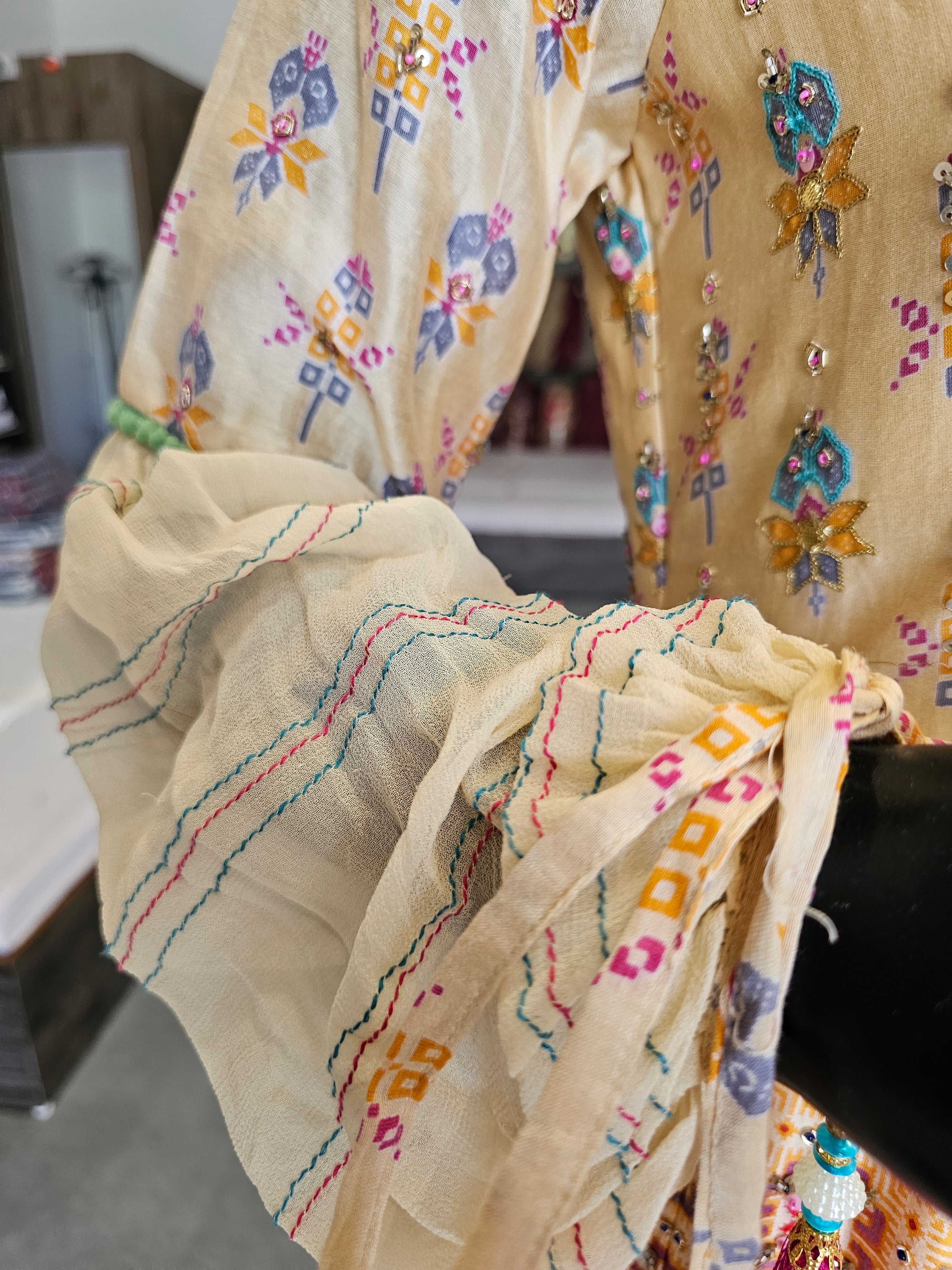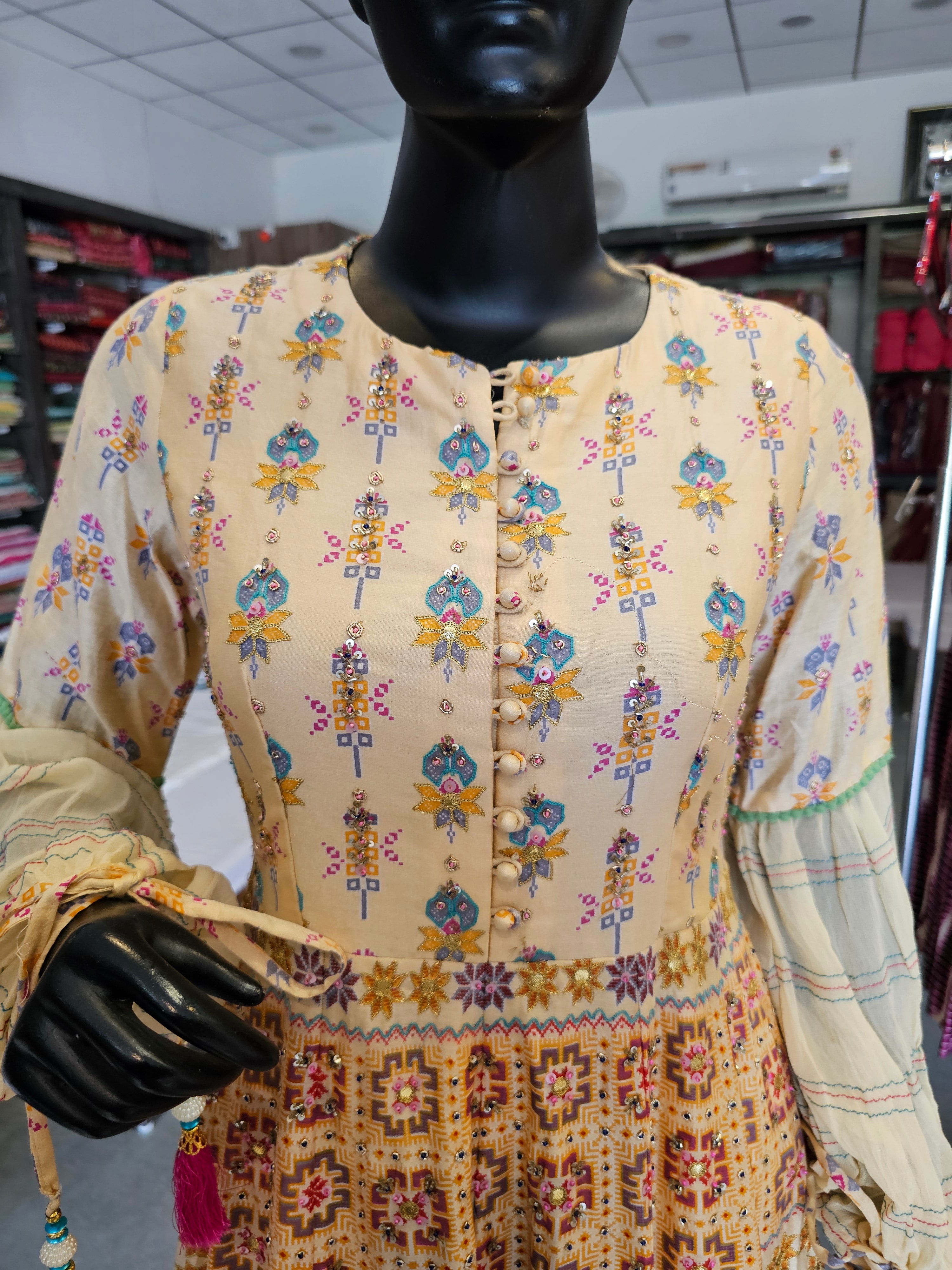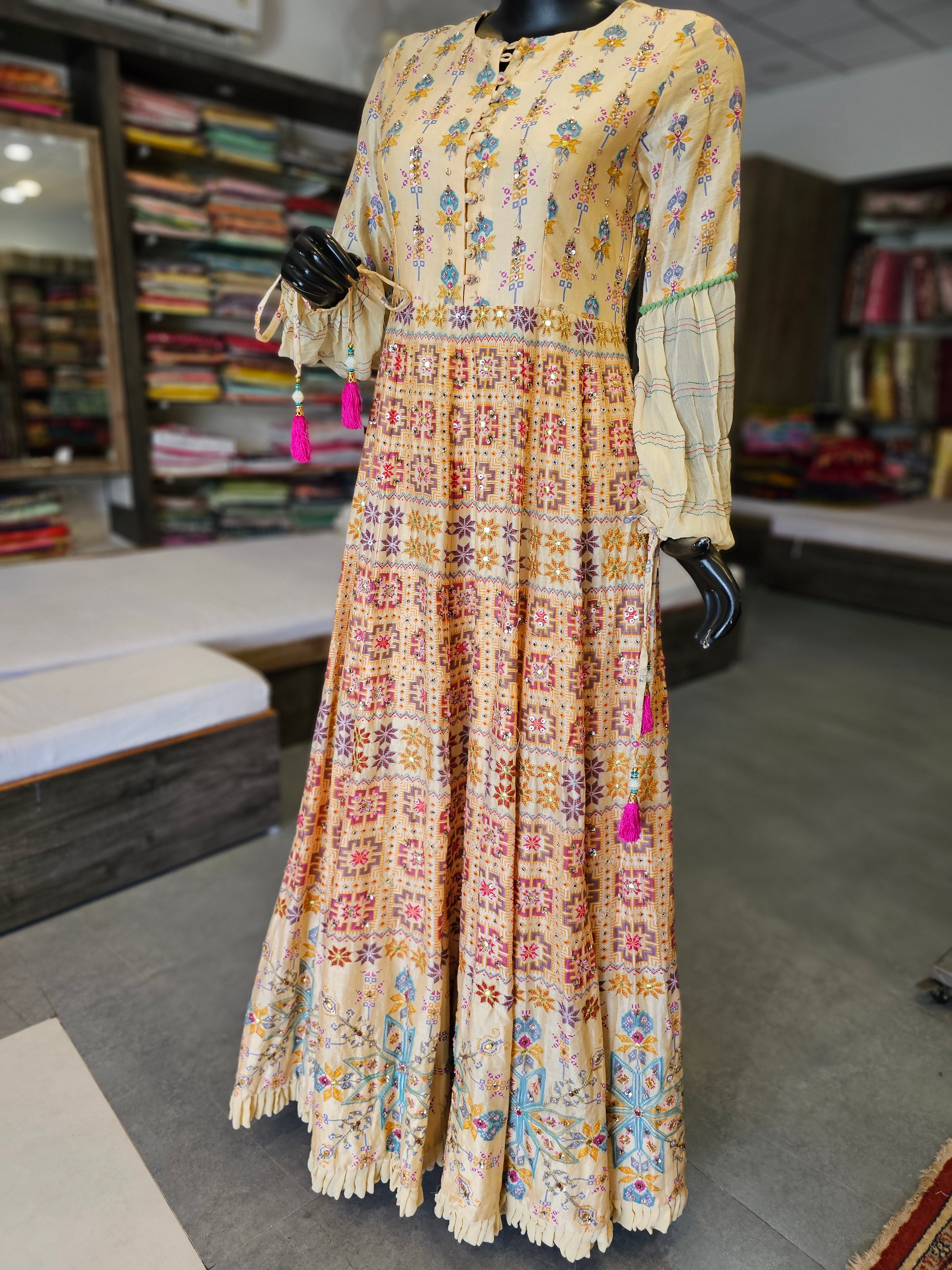 Look elegant in this Premium Pure Chanderi Silk Designer Gown, styled with beautiful hand detailing for a rich and graceful look. Made from soft and lightweight chanderi silk, it offers comfort, shine, and easy draping.