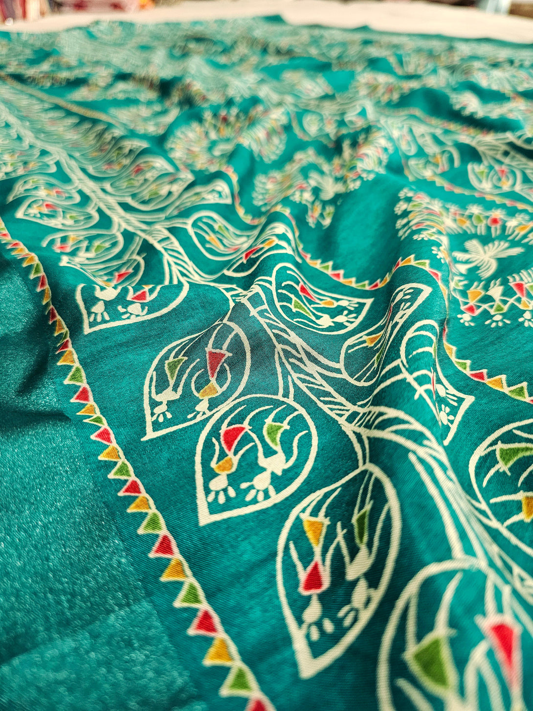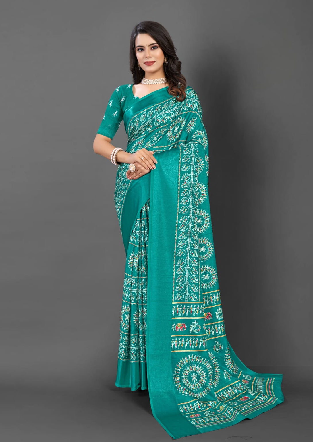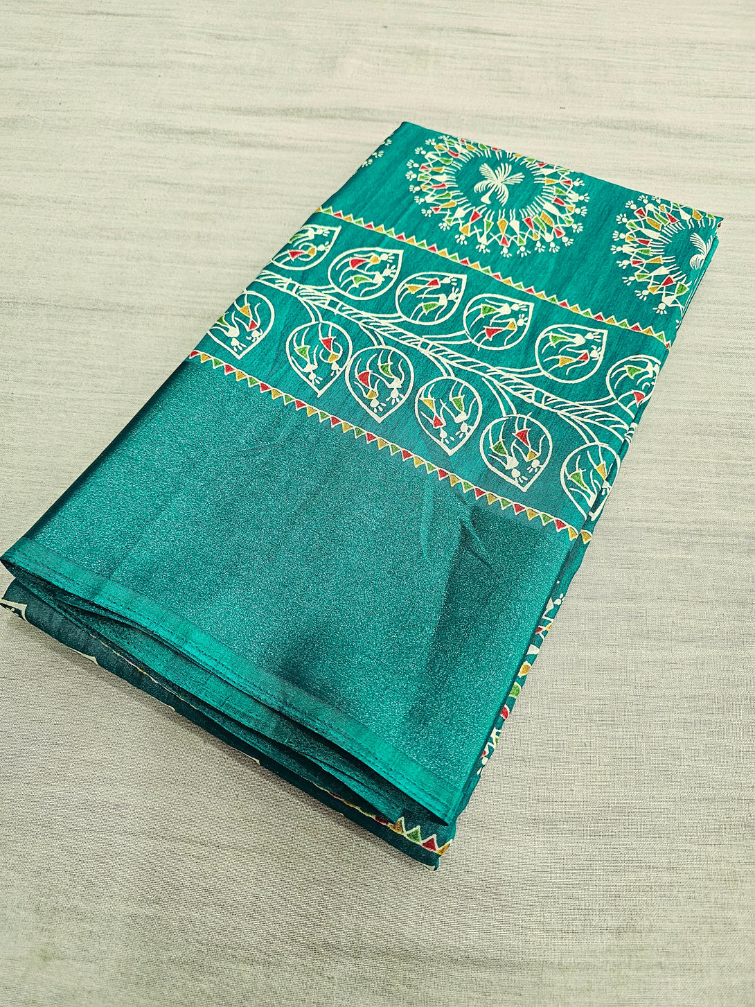 720001 Kalamkari Printed Semi Dola Silk Saree - Teal Green (563005)