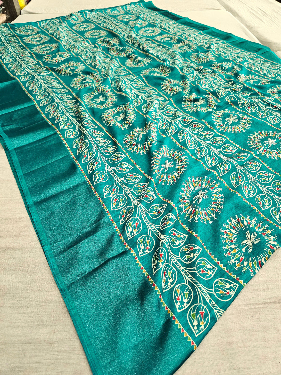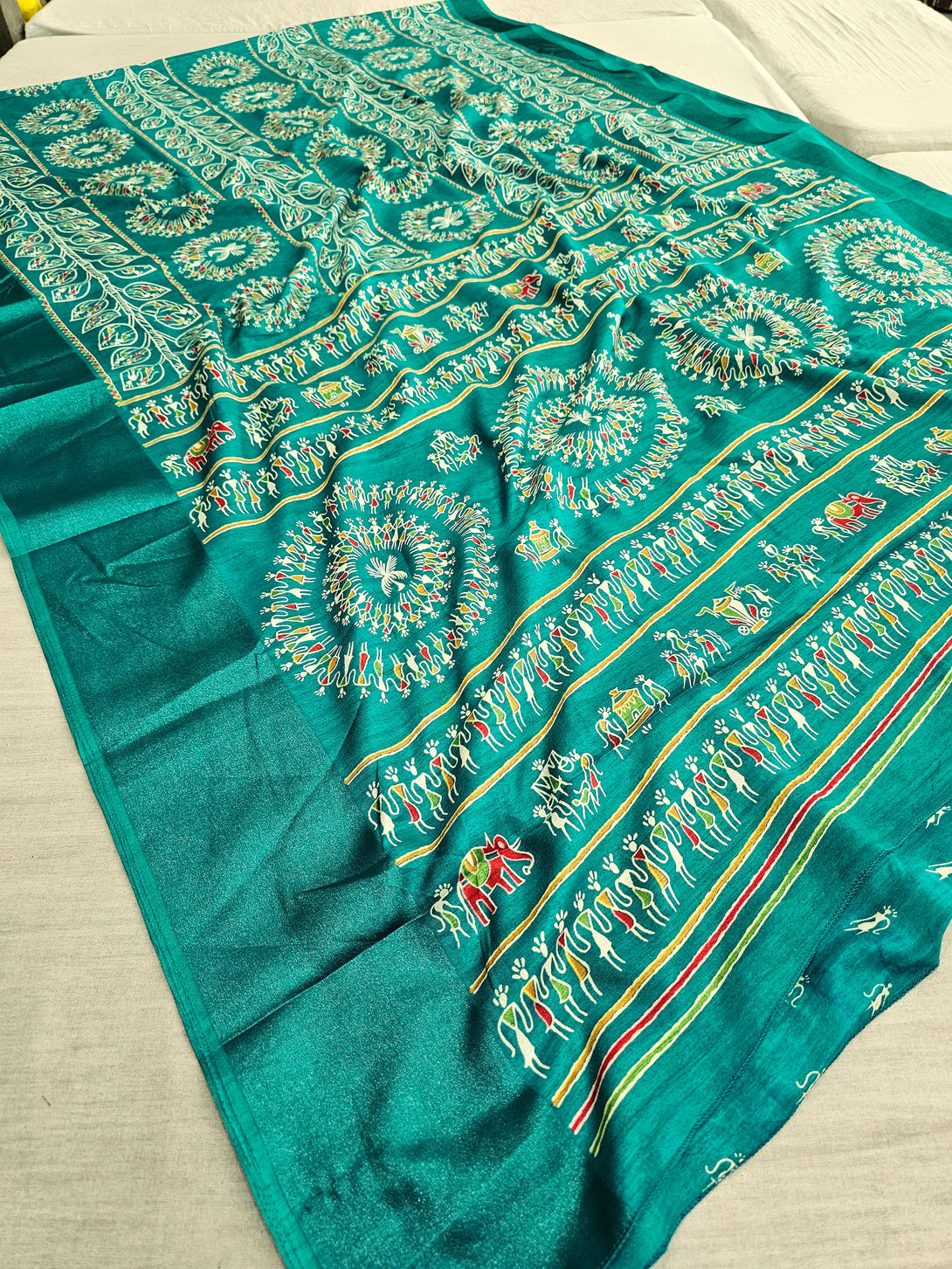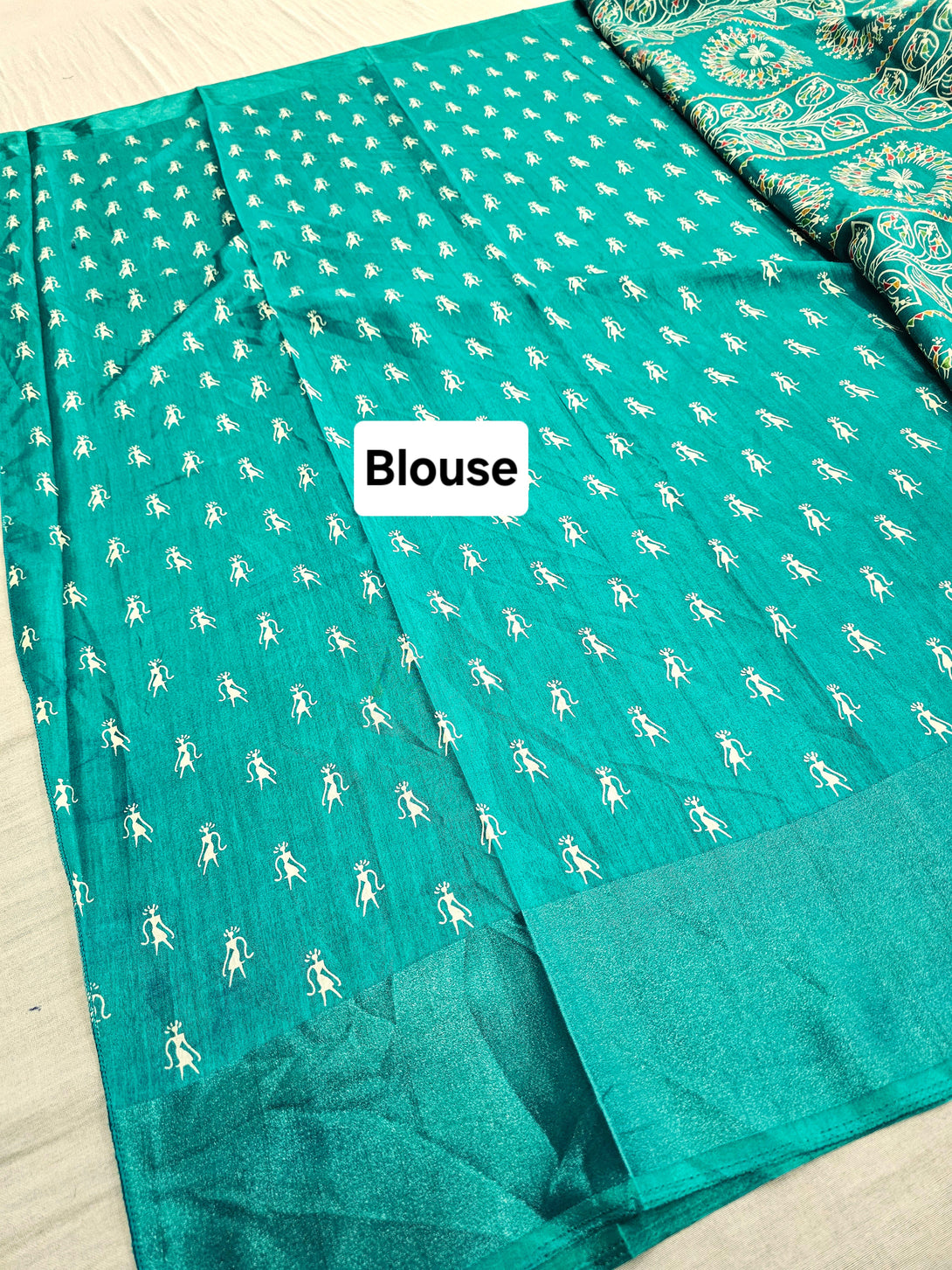 720001 Kalamkari Printed Semi Dola Silk Saree - Teal Green (563005)