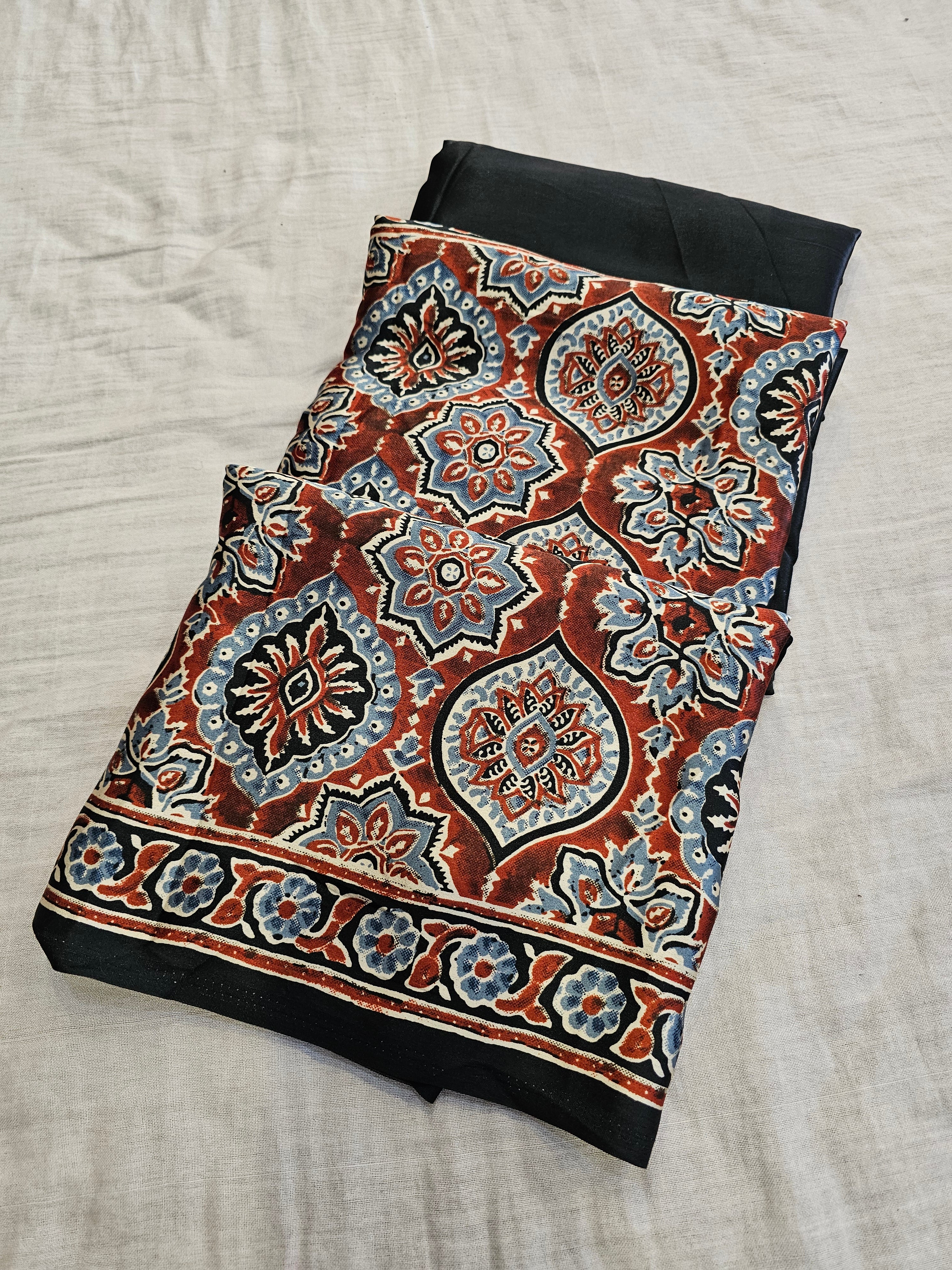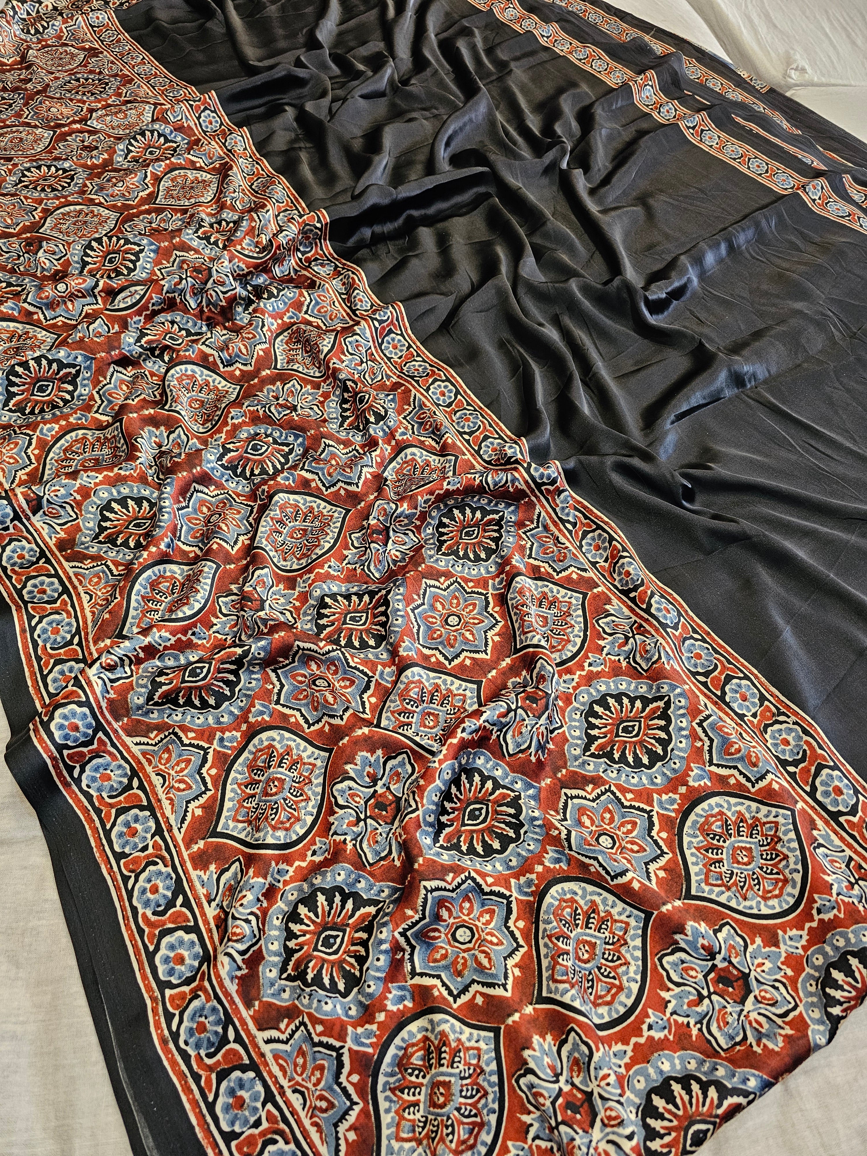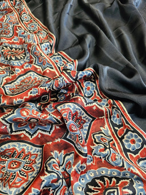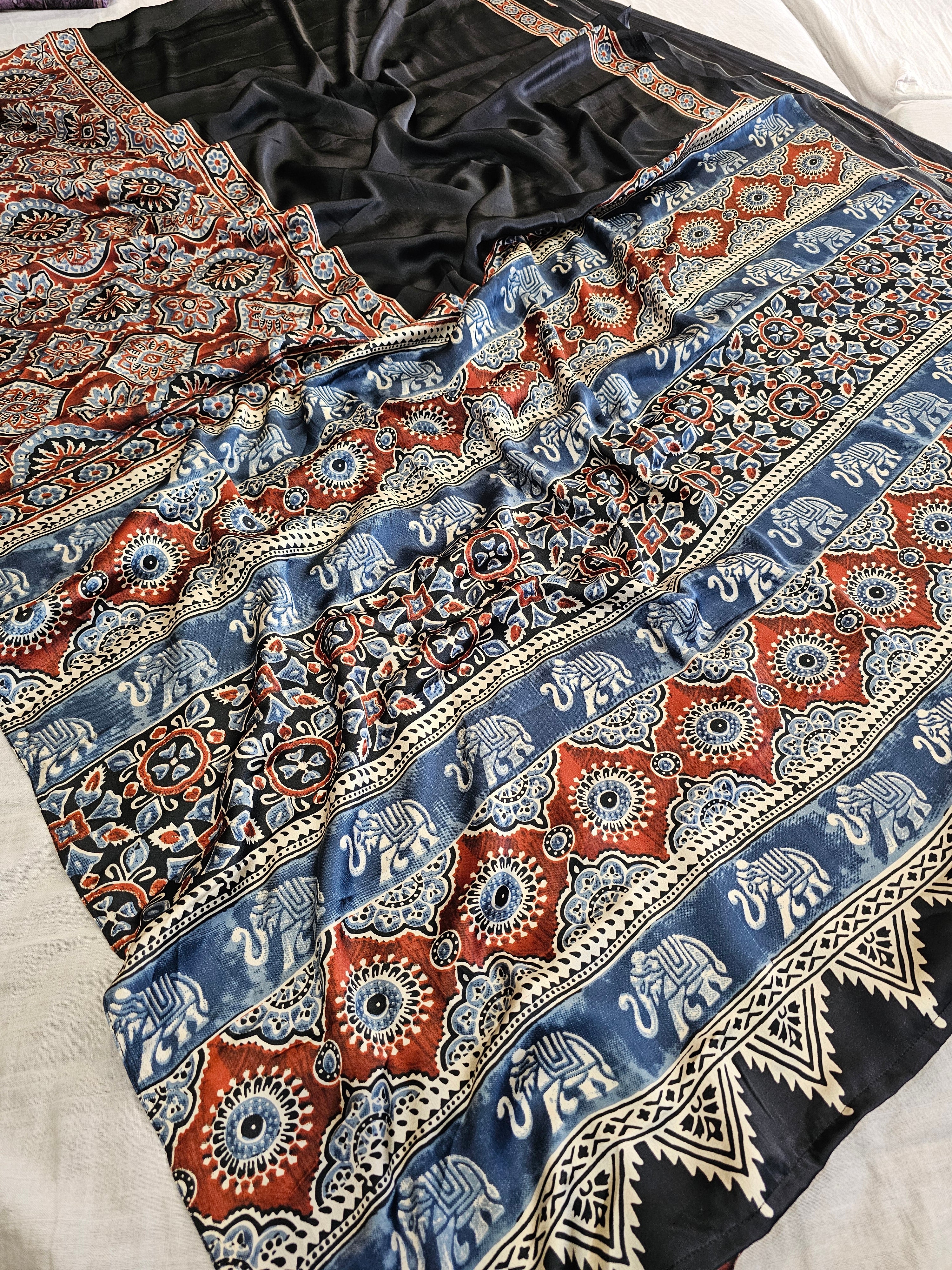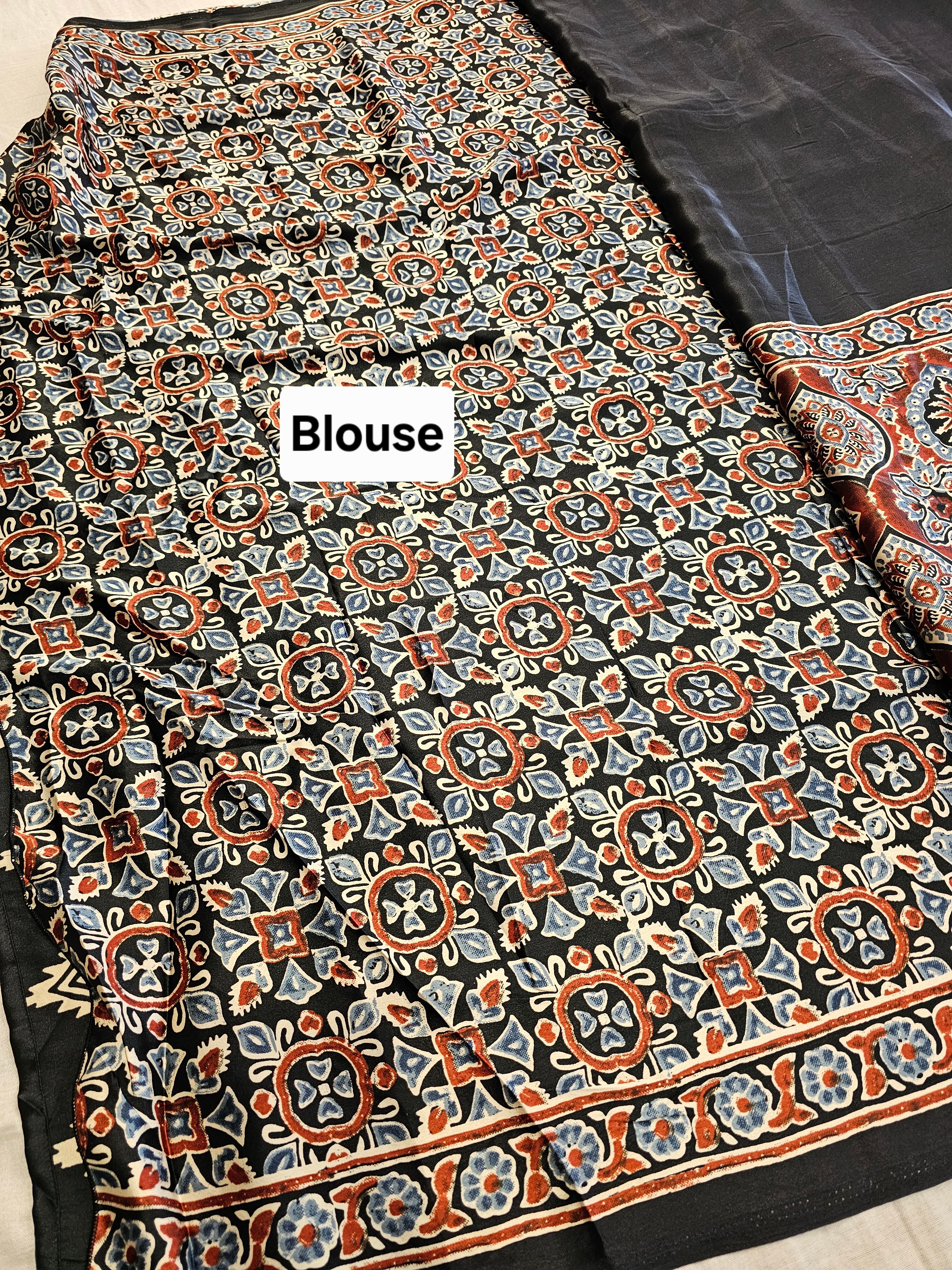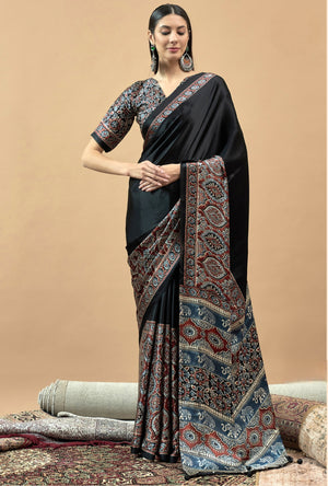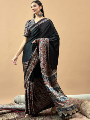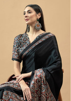 727001 Trending Ajrakh Print Semi Modal Silk Saree - Black