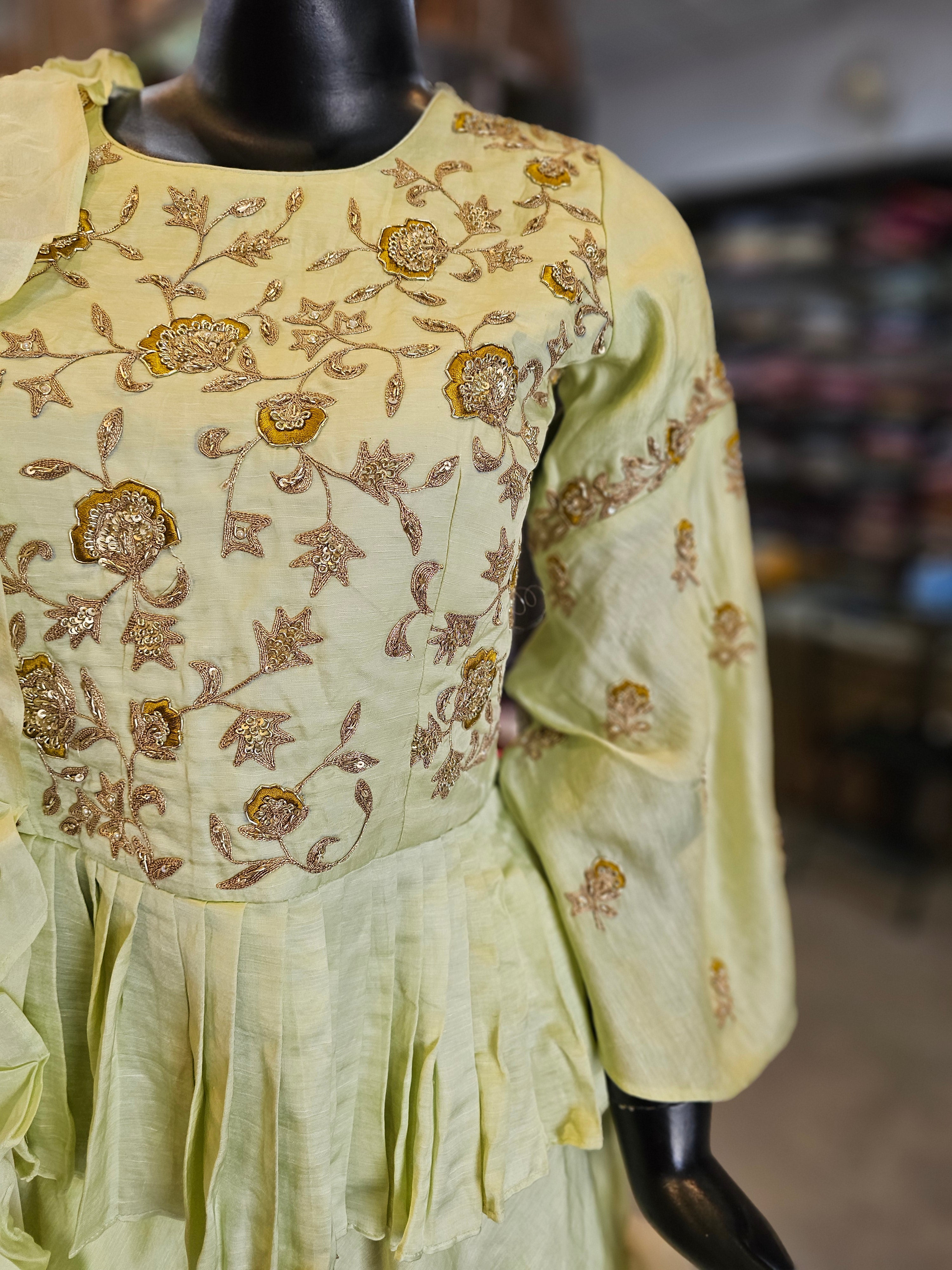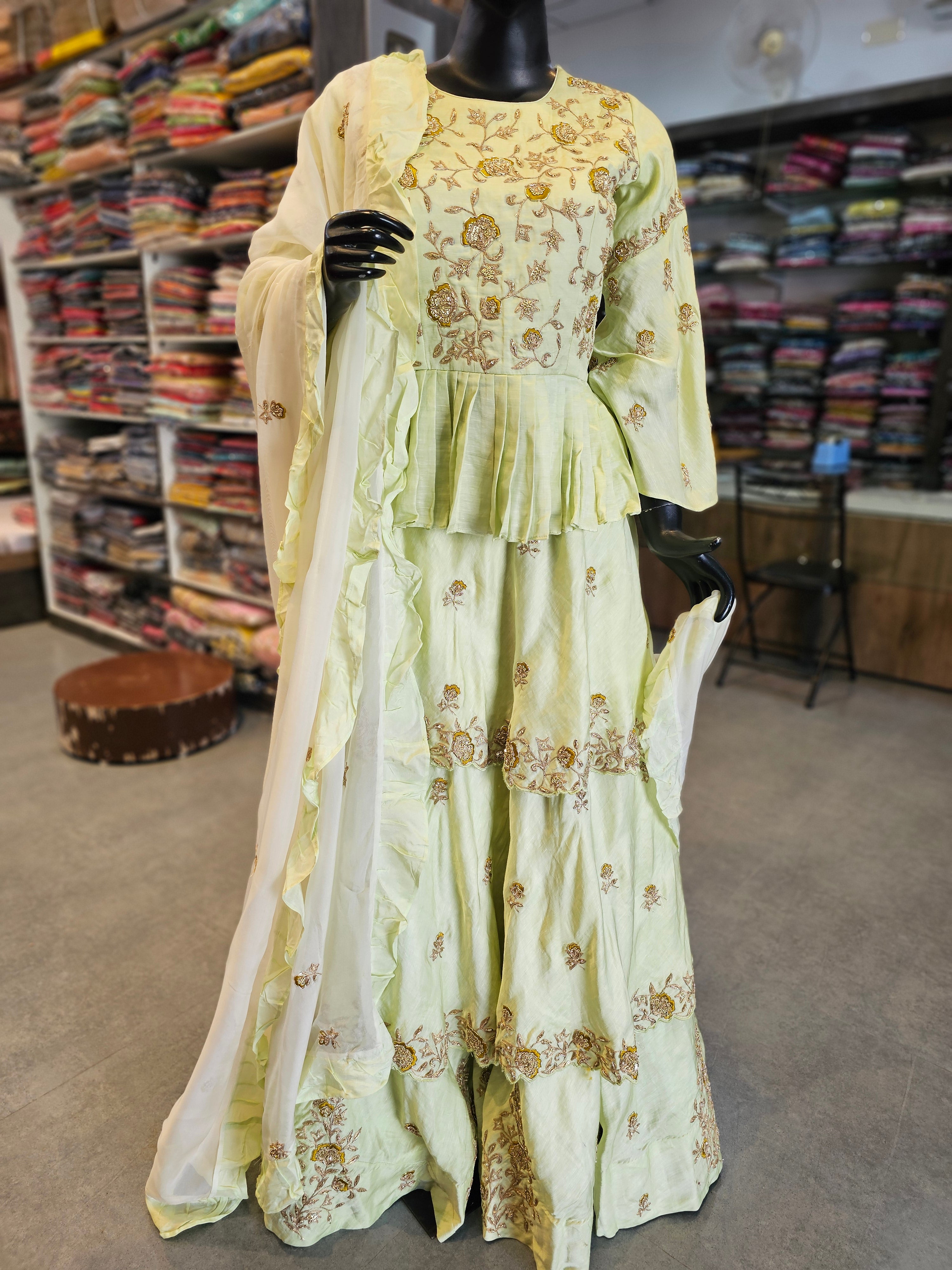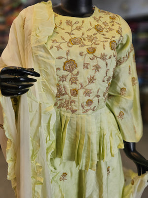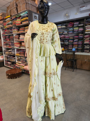 7466 Premium Hand Zardosi Work Maslin Silk Peplum Short Kurti with Laired Skirt with Organza Dupatta