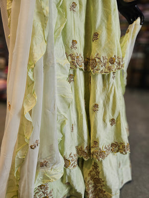 - Material : Kurti - Pure Maslin Silk , Dupatta- Organza Silk , Sharara- Georgette Organza