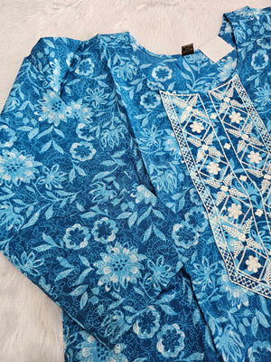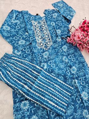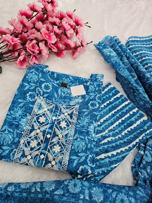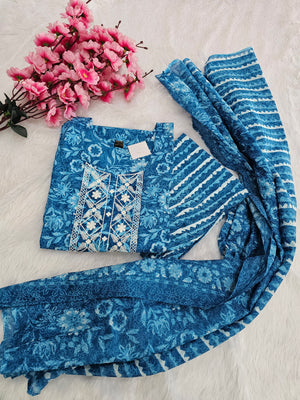 770001 Blue Color Embroidered Pure Cotton Flower Printed Straight Kurti With Pant & Dupatta