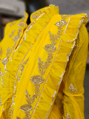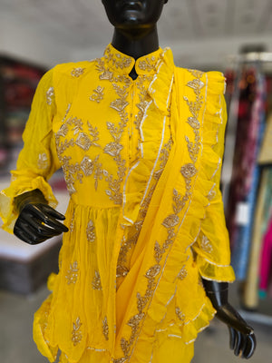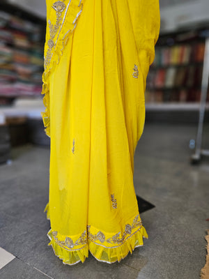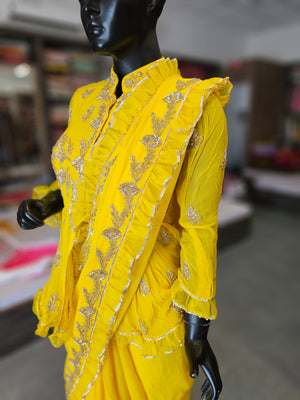 Turn heads with this Stylish Pure Georgette Saree, paired with a ready-to-wear peplum style blouse featuring rich heavy jardosi work. Crafted from lightweight pure georgette, the saree drapes beautifully and feels comfortable for any occasion.