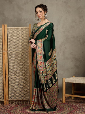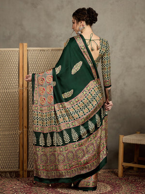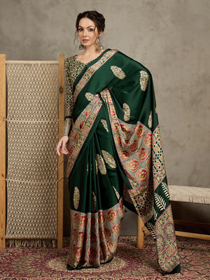 823005 Trending Ajrakh Print Semi Modal Silk Green Saree