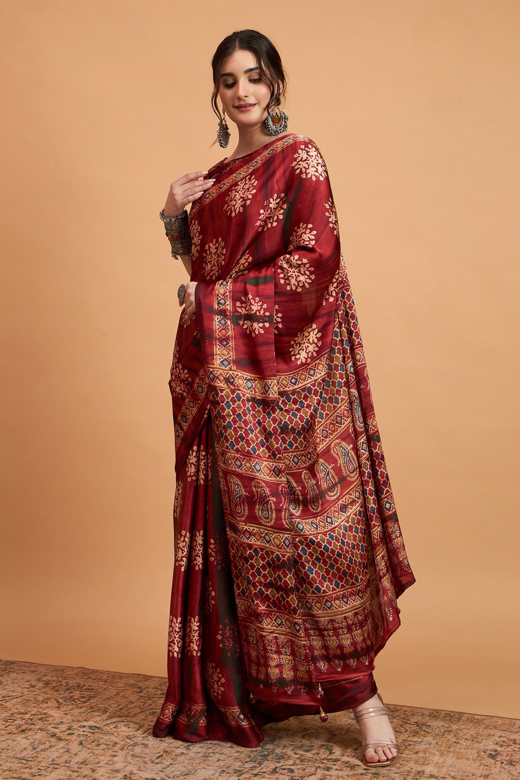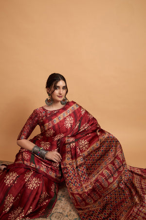 836002 Trending Ajrakh Print Semi Modal Silk Saree - Maroon