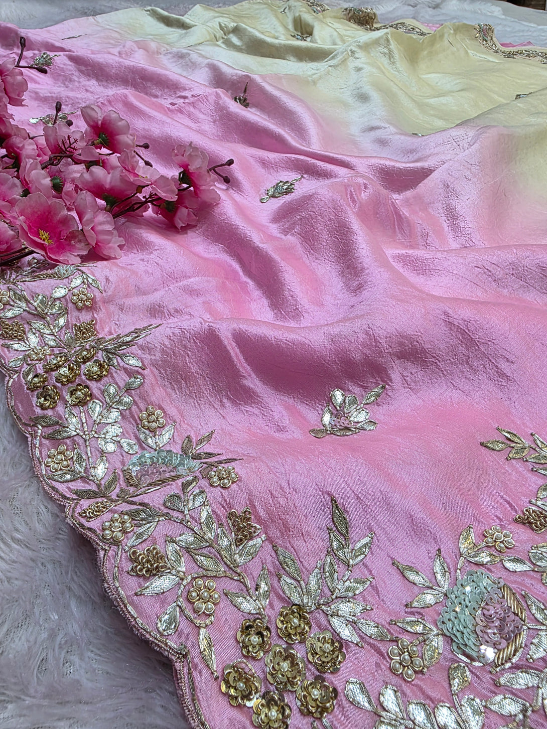 Elevate your party look with this Stylish Pure Russian Silk Saree featuring elegant handwork. Comes with  Hand Gotawork & Zardosi Work . Perfect for weddings, receptions, and festive occasions.