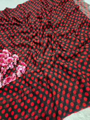 845003 Lightweight Elegant Semi Chiffon Polki Dot Print Saree - Black Red