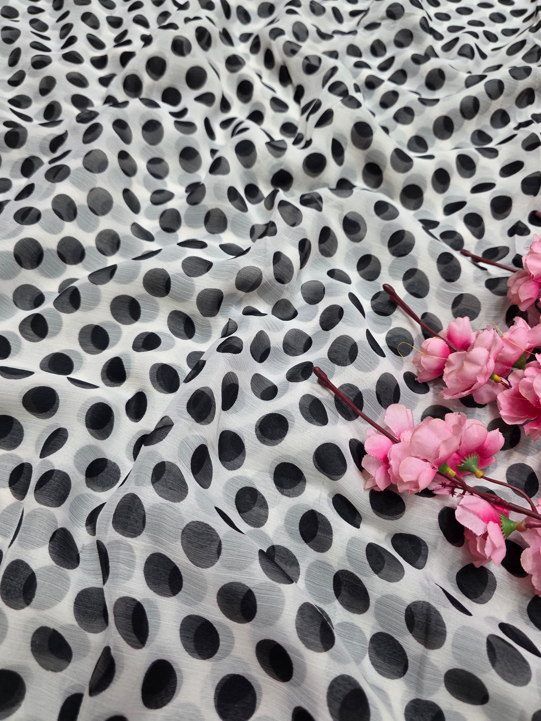 845003 Lightweight Elegant Semi Chiffon Polki Dot Print Saree - White Black