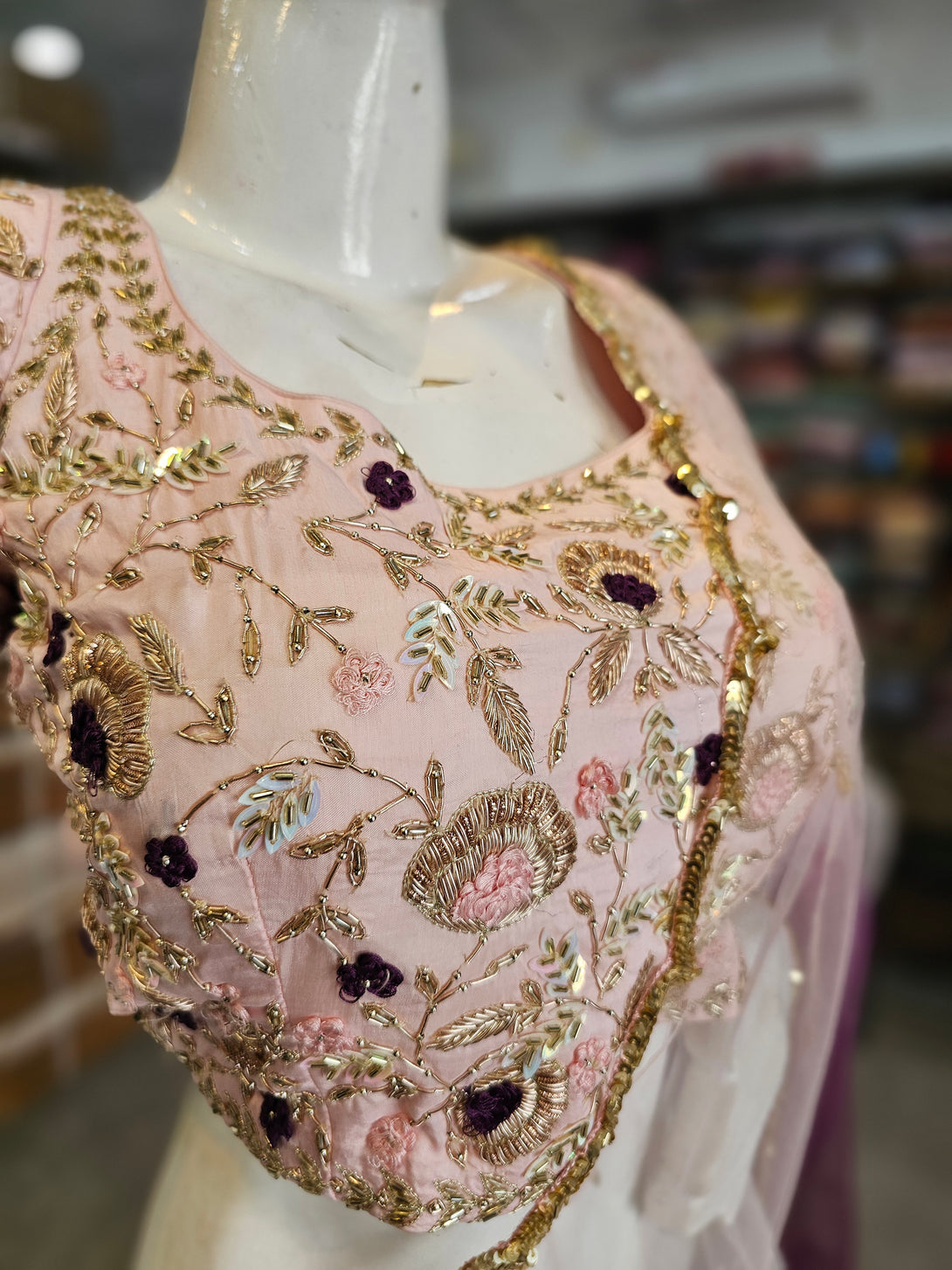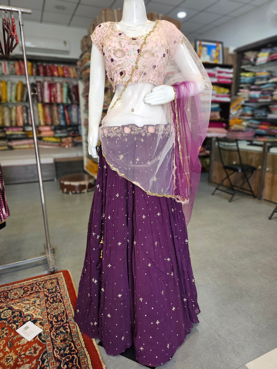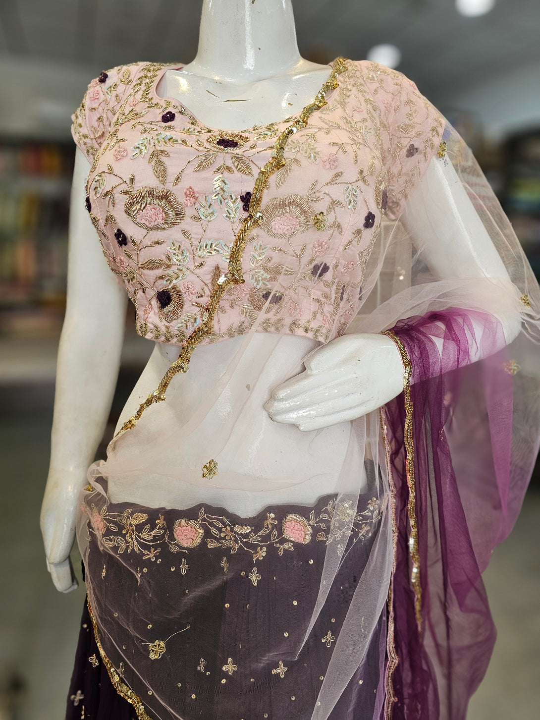 Make a grand style statement with this Pure Georgette stitched Lehenga, beautifully designed with Hand Zardozi work. It comes with a heavy Zardozi work stitched blouse and an elegant 2.5 mtr Soft Net dupatta, perfect for weddings and festive occasions.