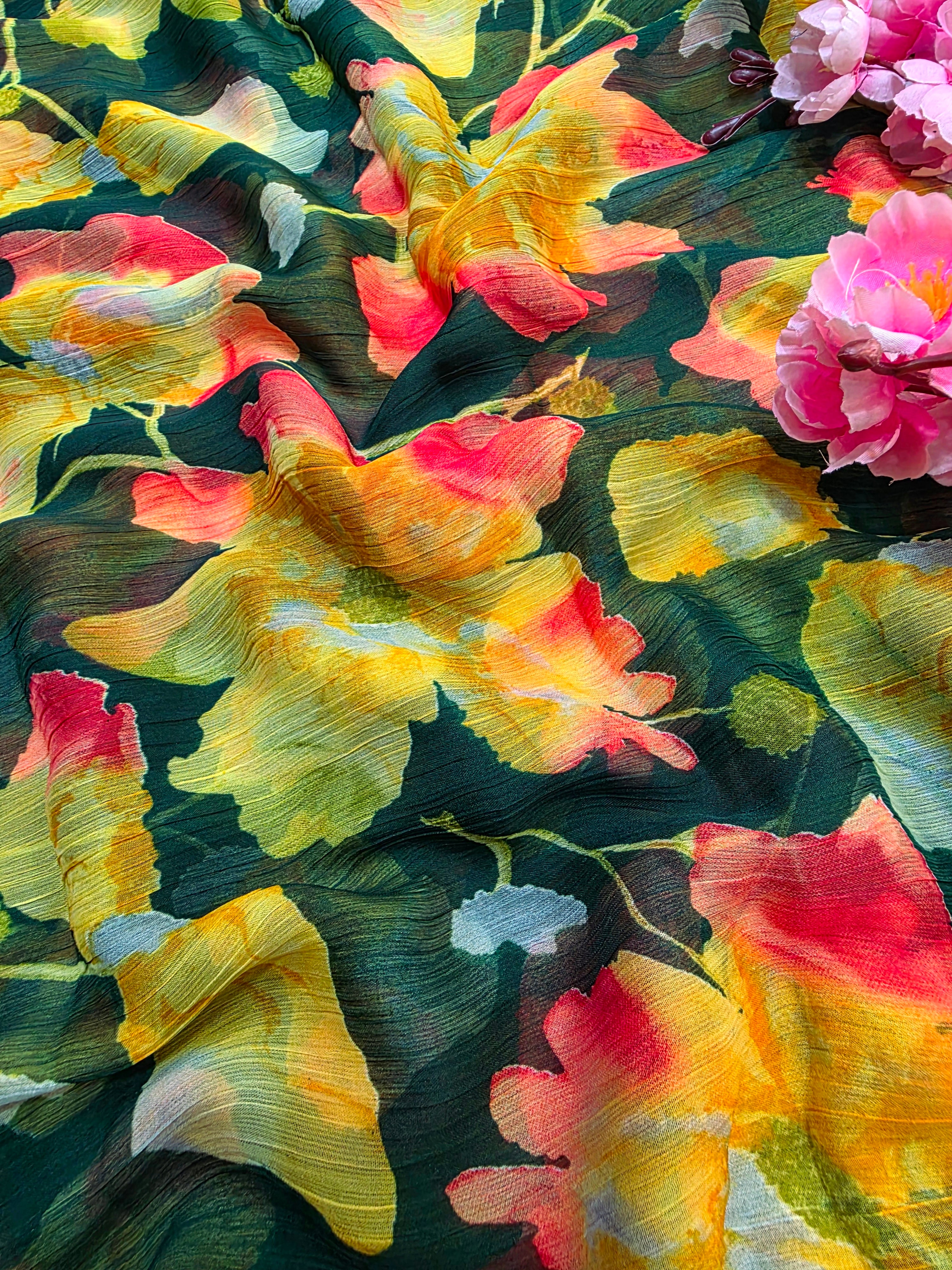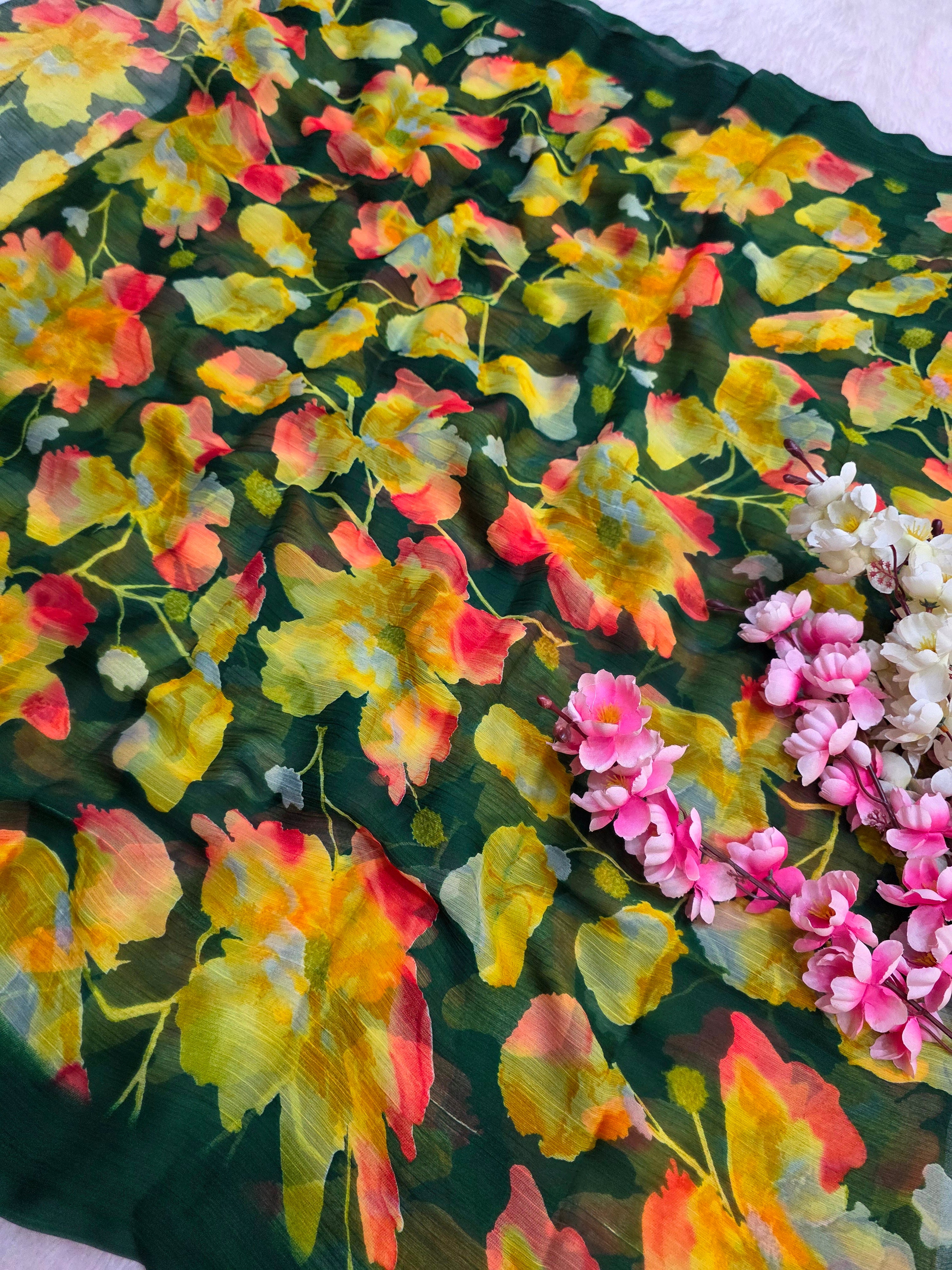 Flower Print Semi-Chiffon Saree Without Blouse – Perfect Blend of Elegance and Comfort