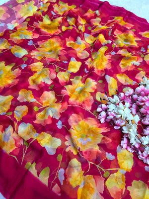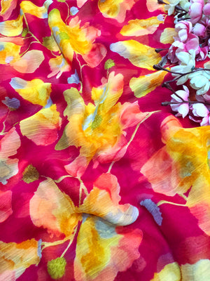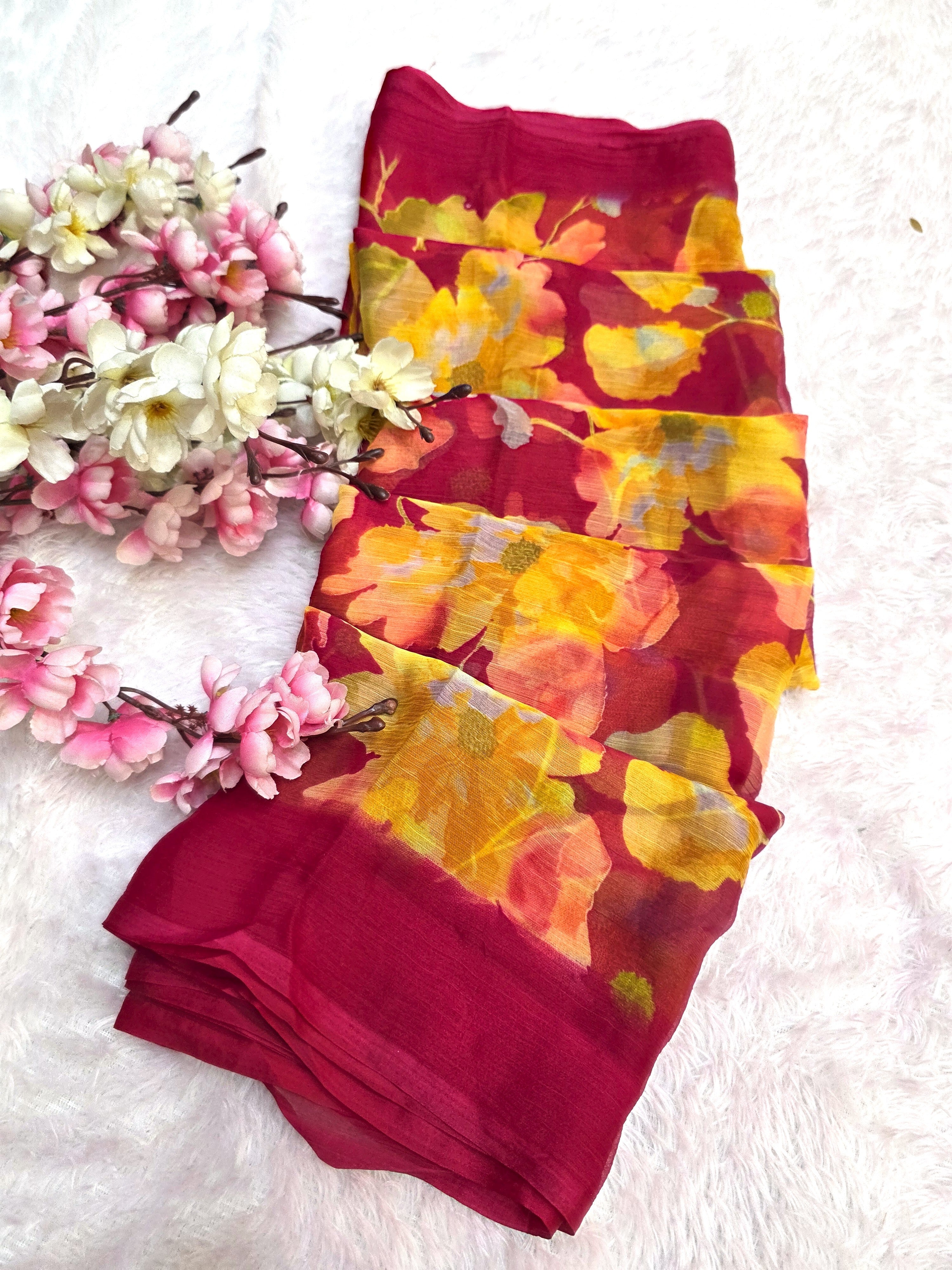 Flower Print Semi-Chiffon Saree Without Blouse – Perfect Blend of Elegance and Comfort