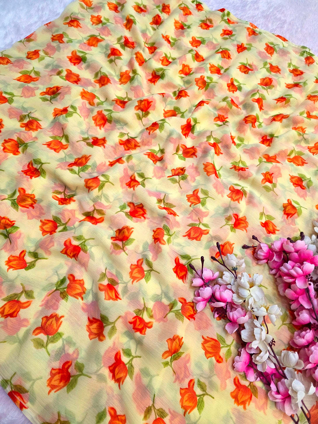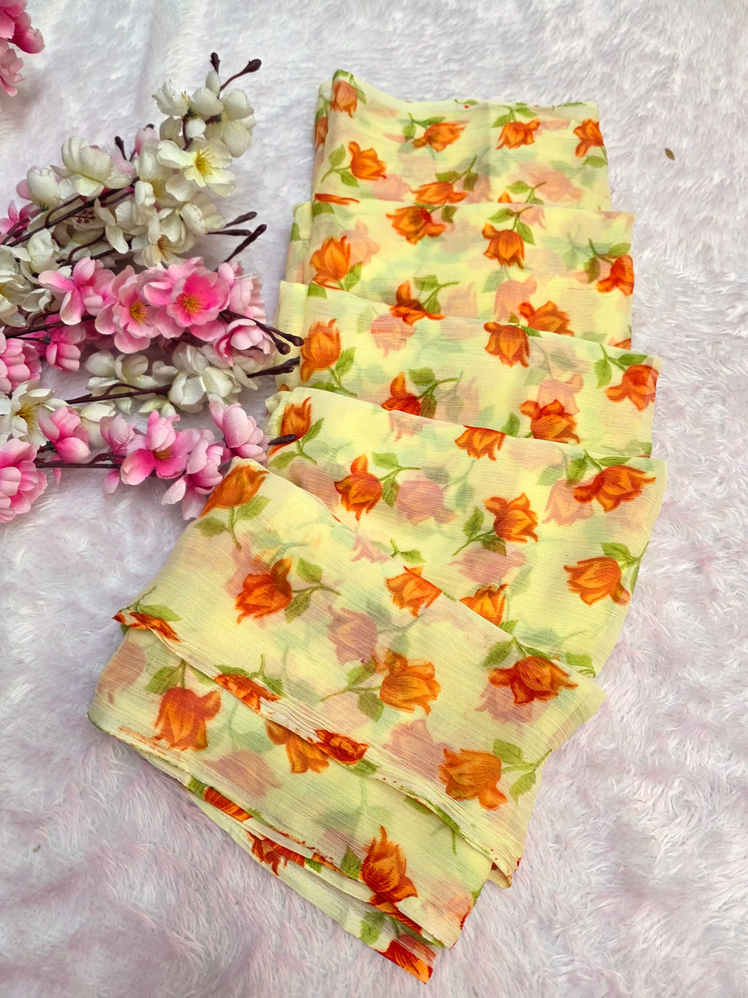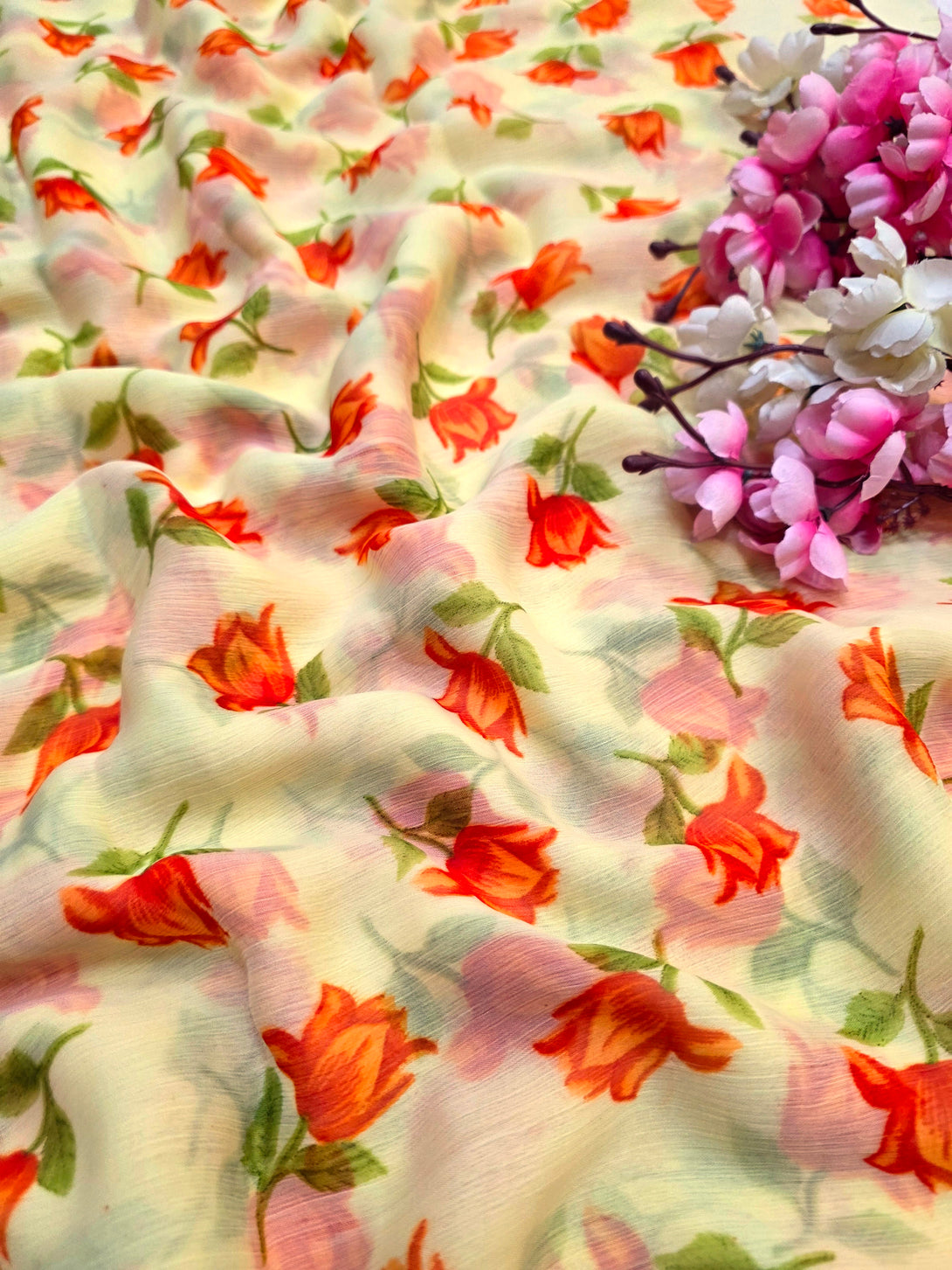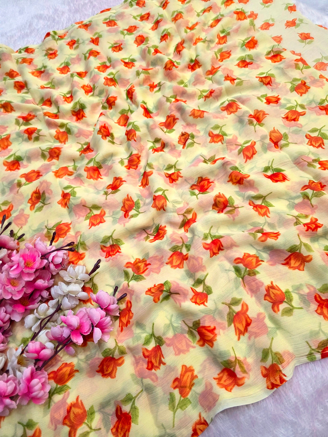 Flower Print Semi-Chiffon Saree Without Blouse – Perfect Blend of Elegance and Comfort