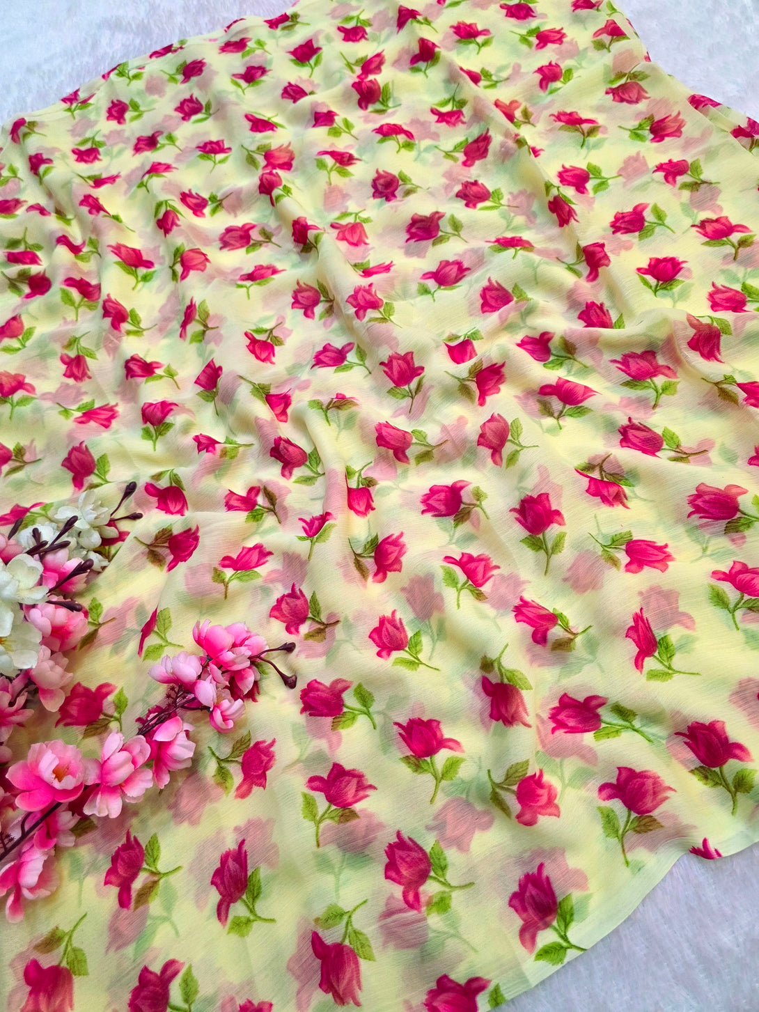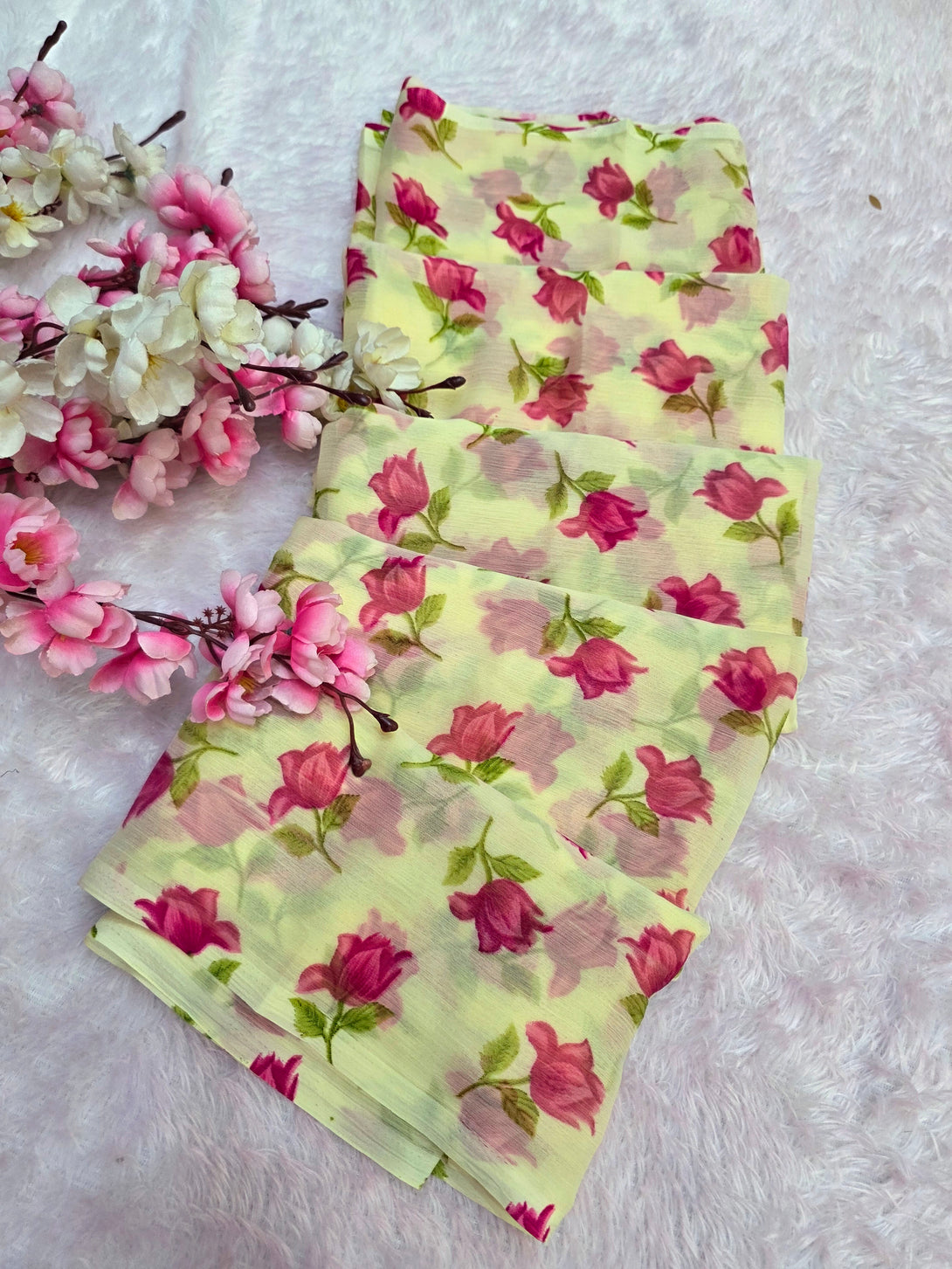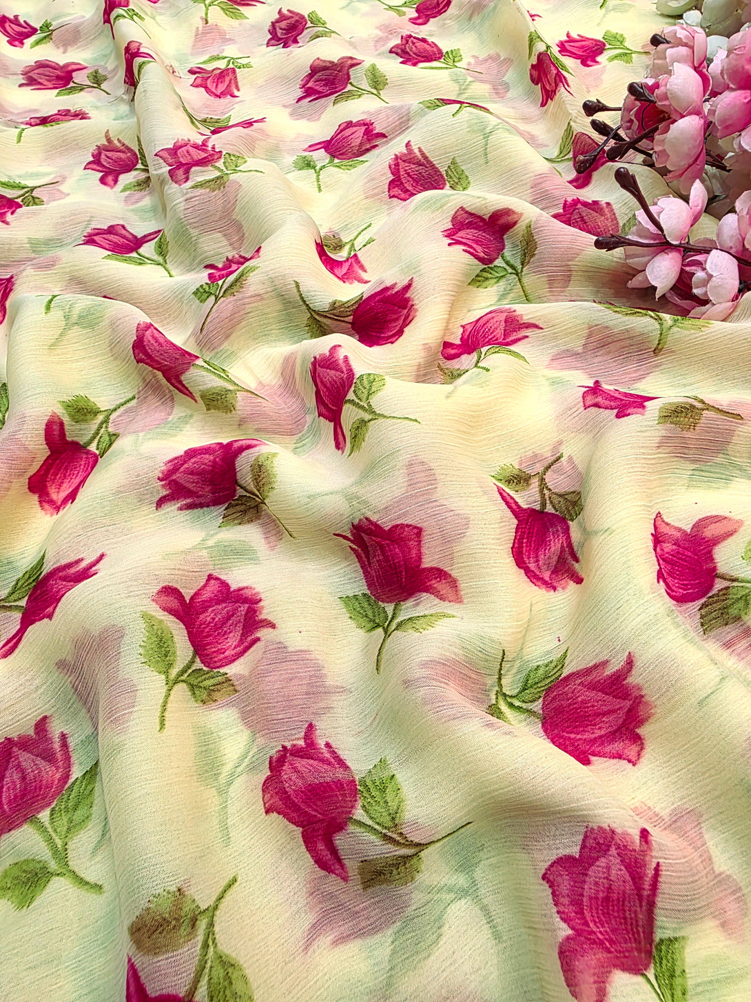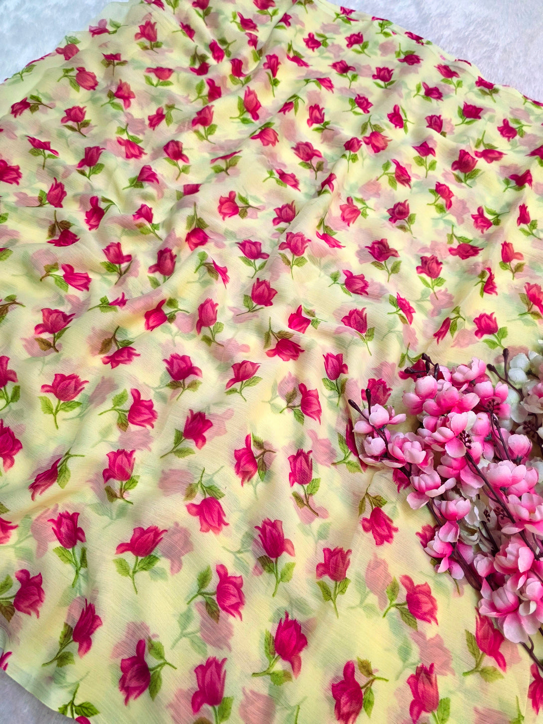 Flower Print Semi-Chiffon Saree Without Blouse – Perfect Blend of Elegance and Comfort