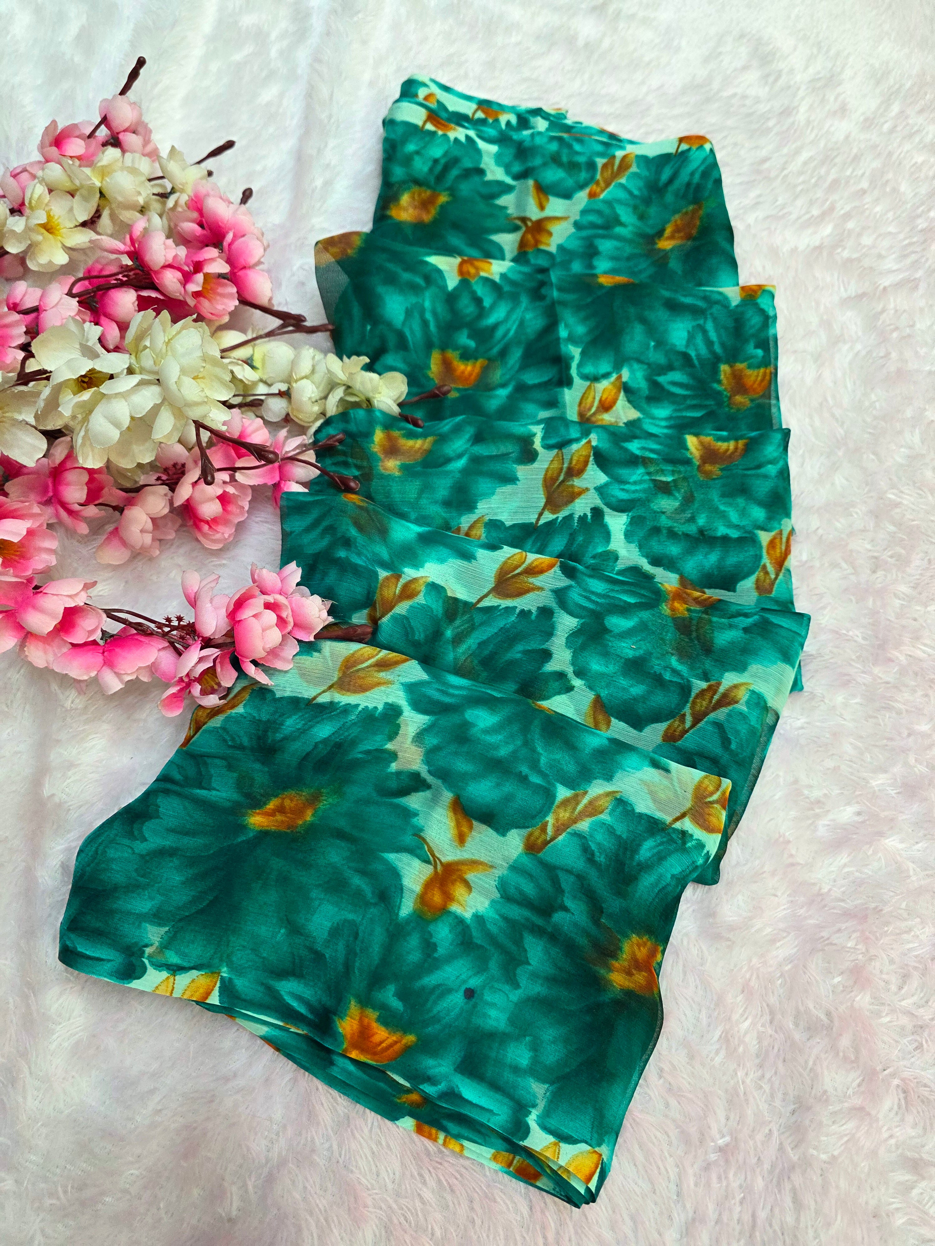 Flower Print Semi-Chiffon Saree Without Blouse – Perfect Blend of Elegance and Comfort