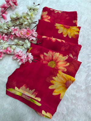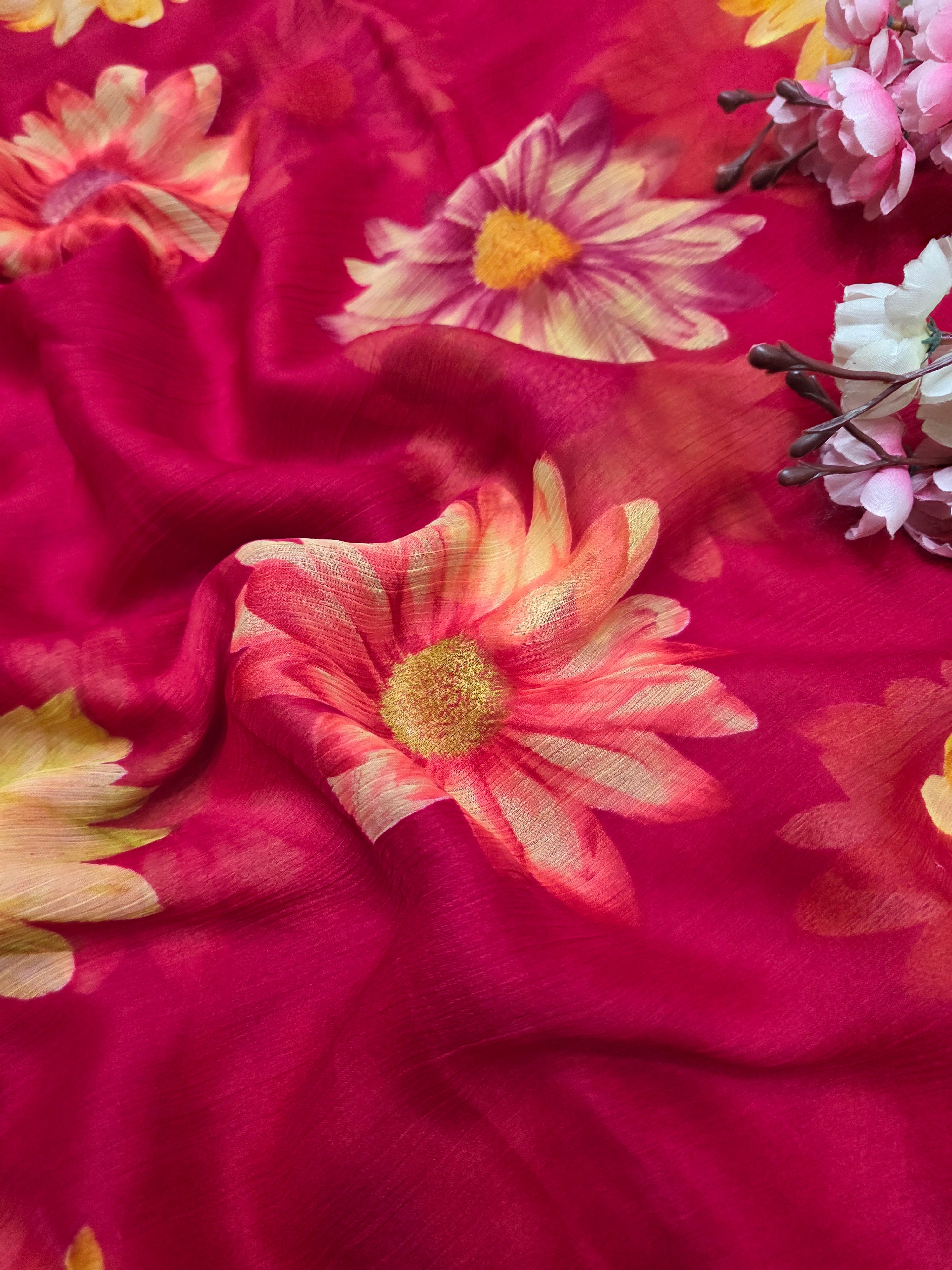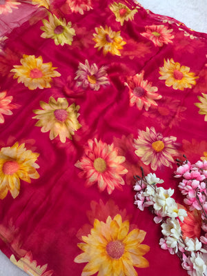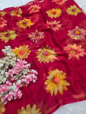 852004 Lightweight Elegant Semi Chiffon Flower Print Saree - Rani