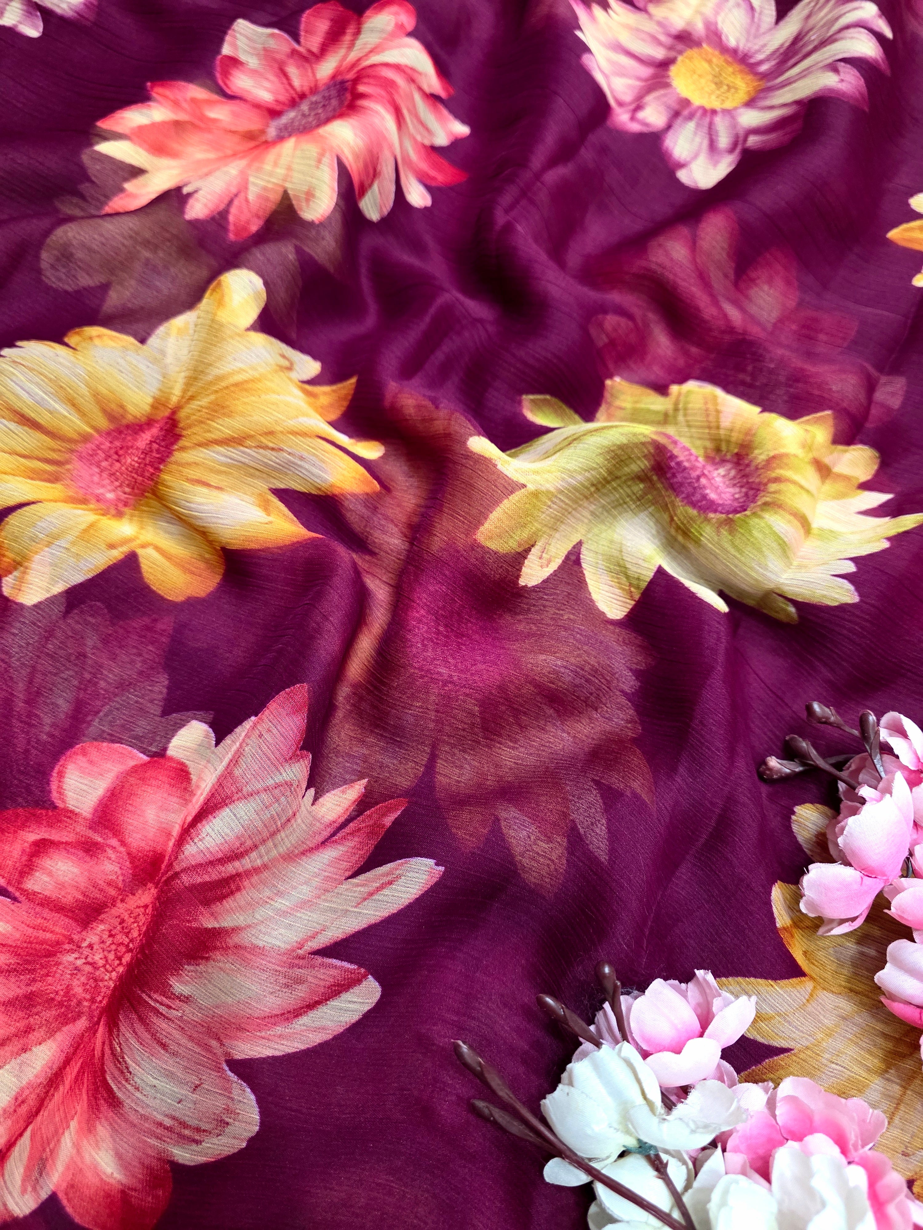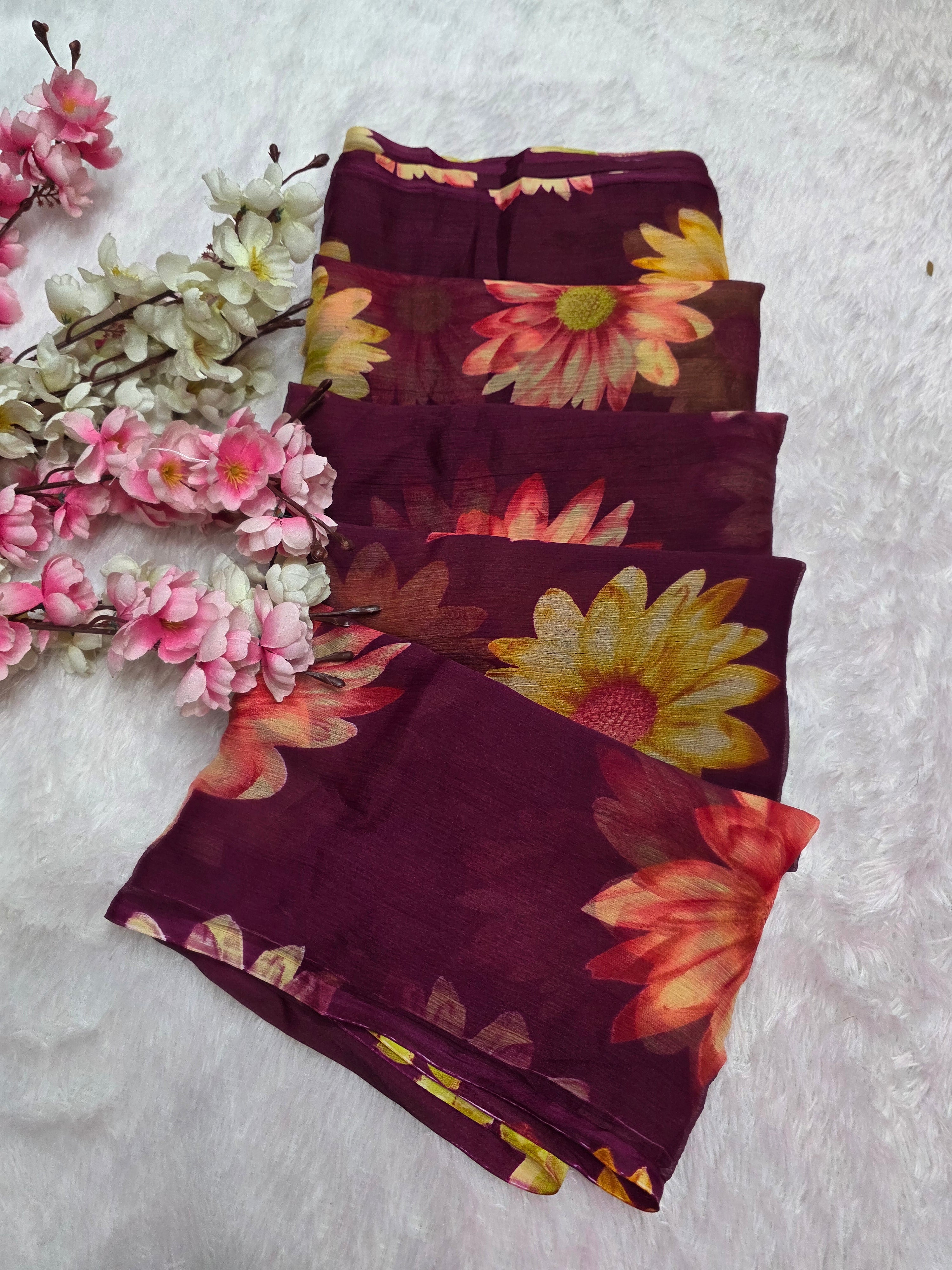 Flower Print Semi-Chiffon Saree Without Blouse – Perfect Blend of Elegance and Comfort