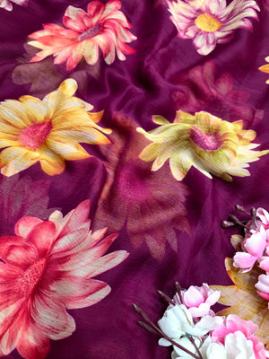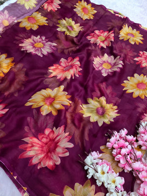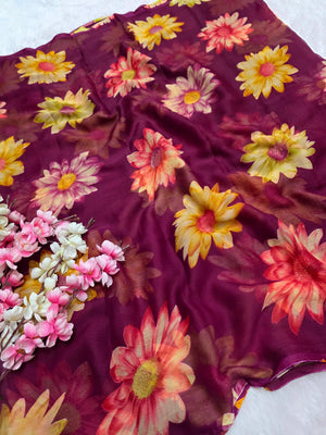 852004 Lightweight Elegant Semi Chiffon Flower Print Saree - Wine