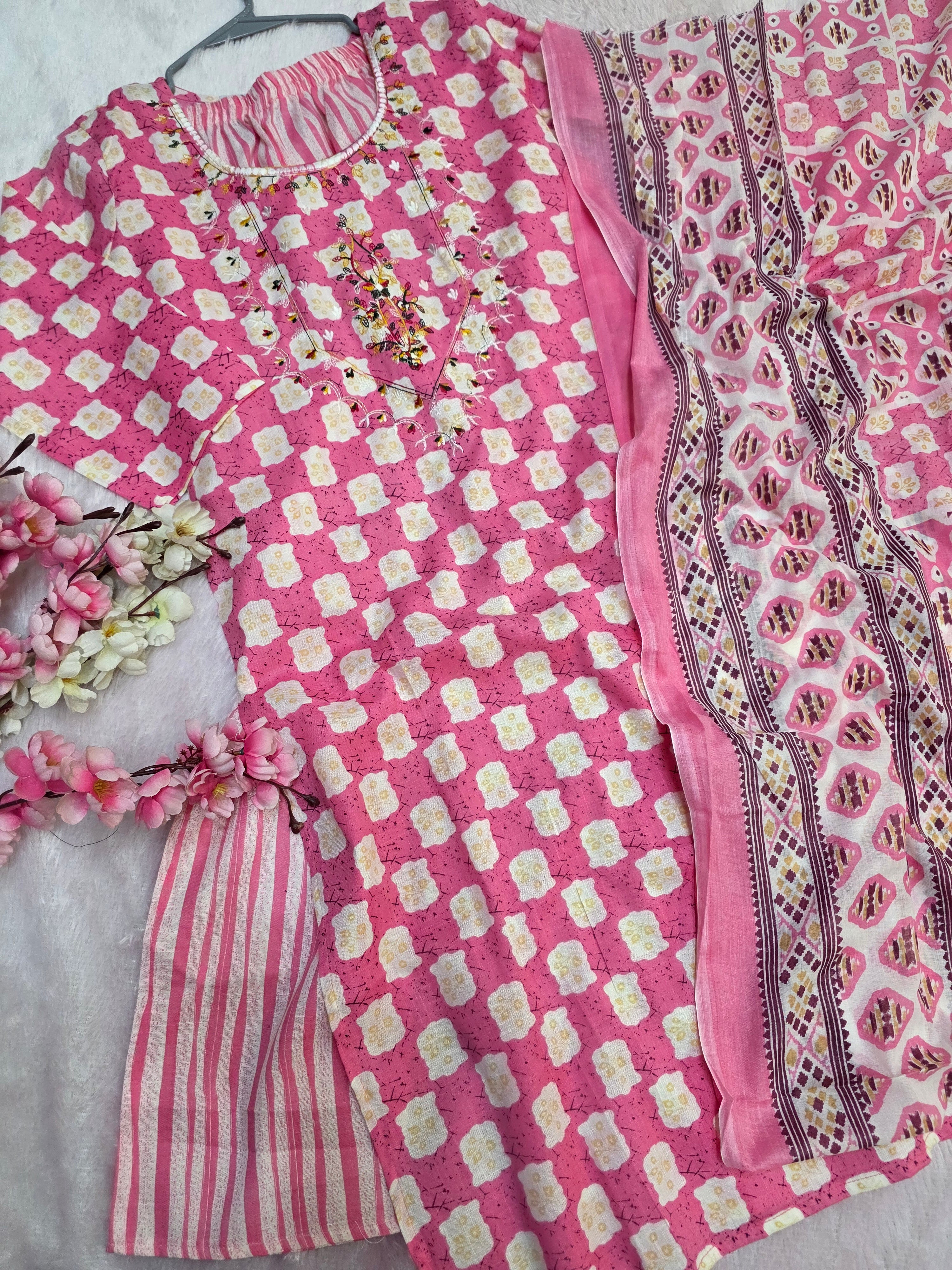 867001 Straight Cotton Kurti with Embroidery With Pant and Dupatta Set