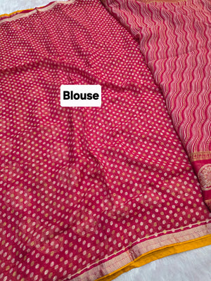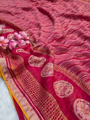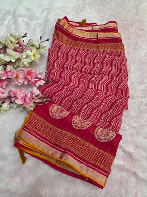 871002 Traditional Chiffon Lehriya Saree with Ajrakh Pallu - Rani