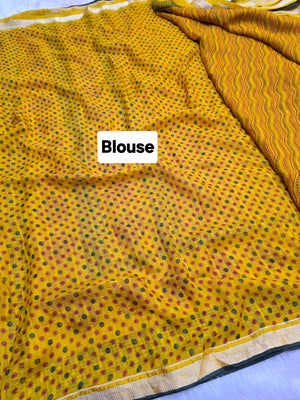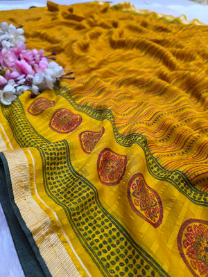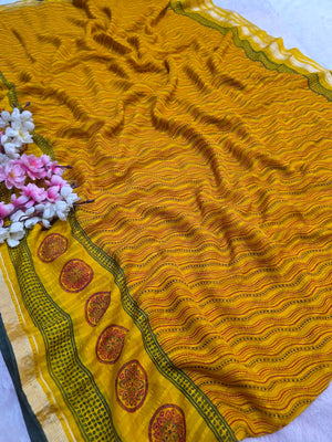 871002 Traditional Chiffon Lehriya Saree with Ajrakh Pallu - Yellow