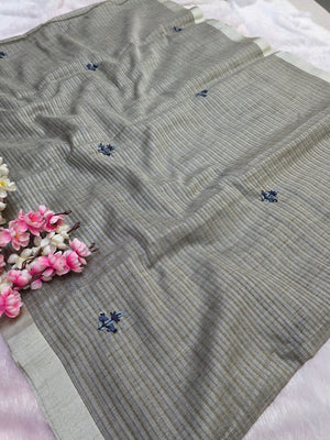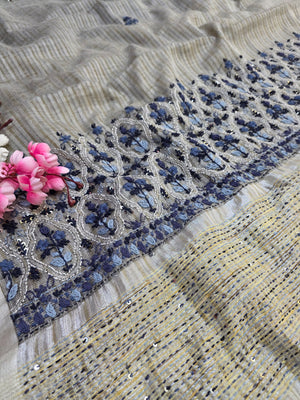 878002 Pure Kota Cotton Silk Hand Embroidery Suta Work Saree - Gray