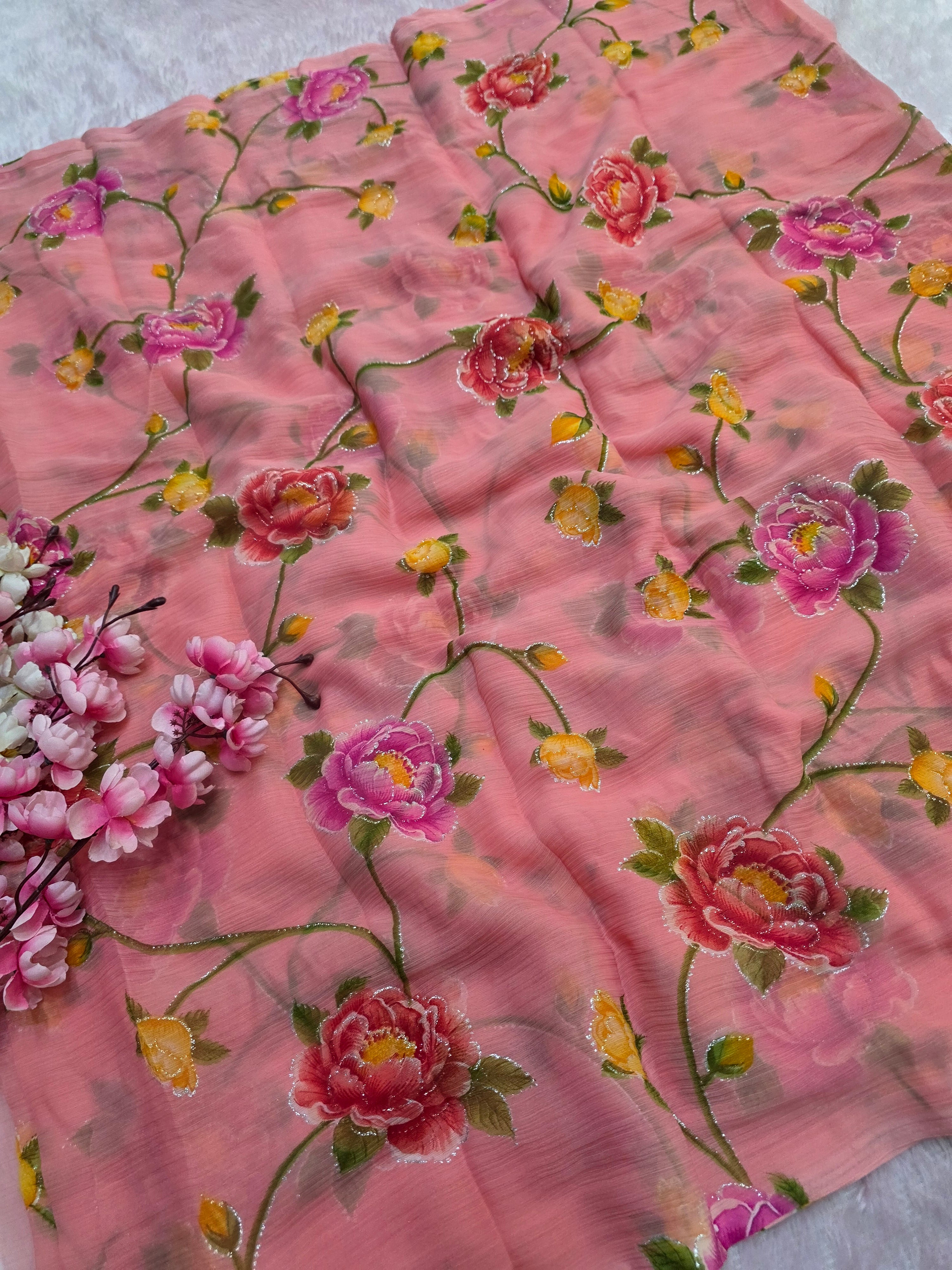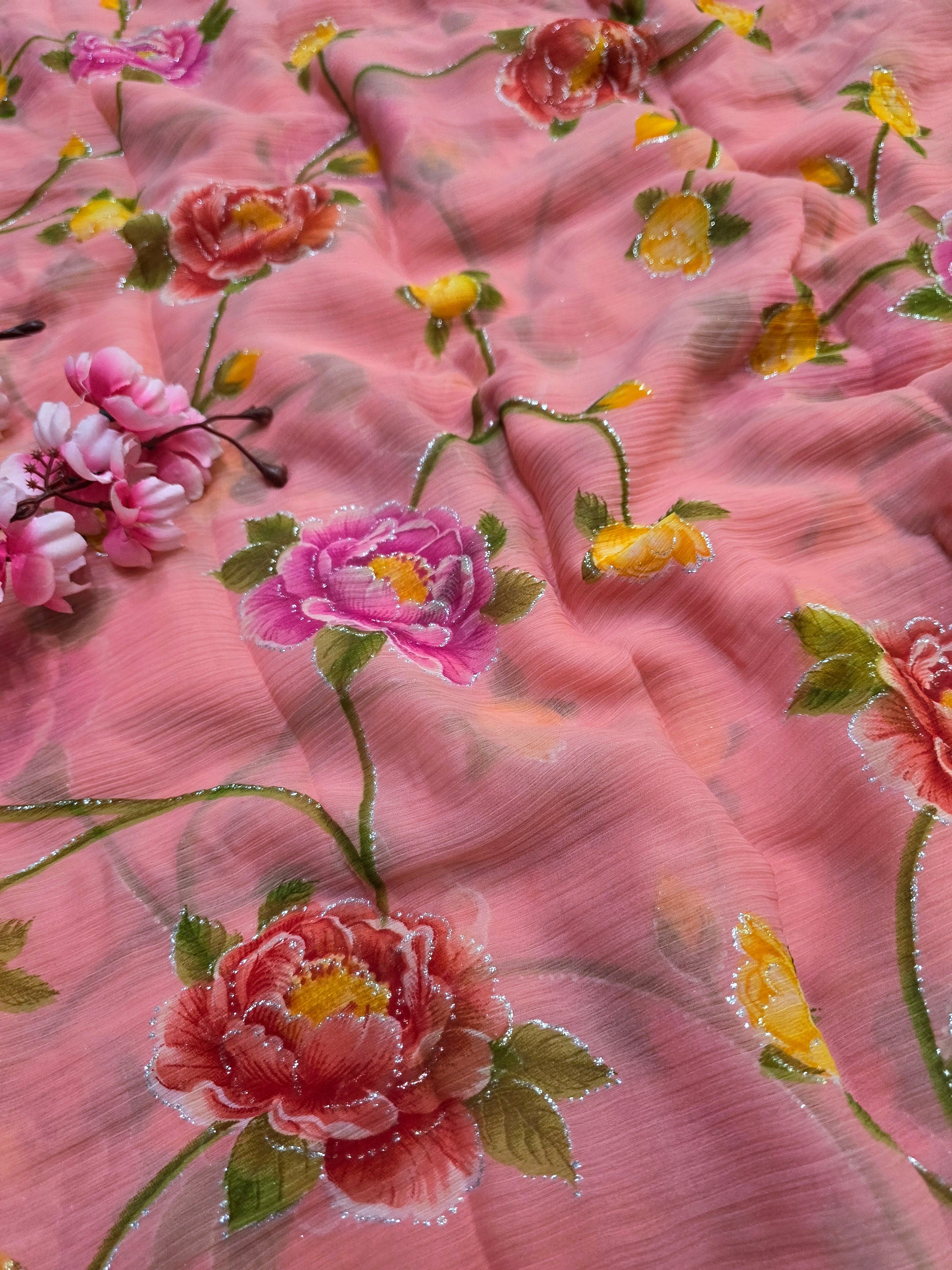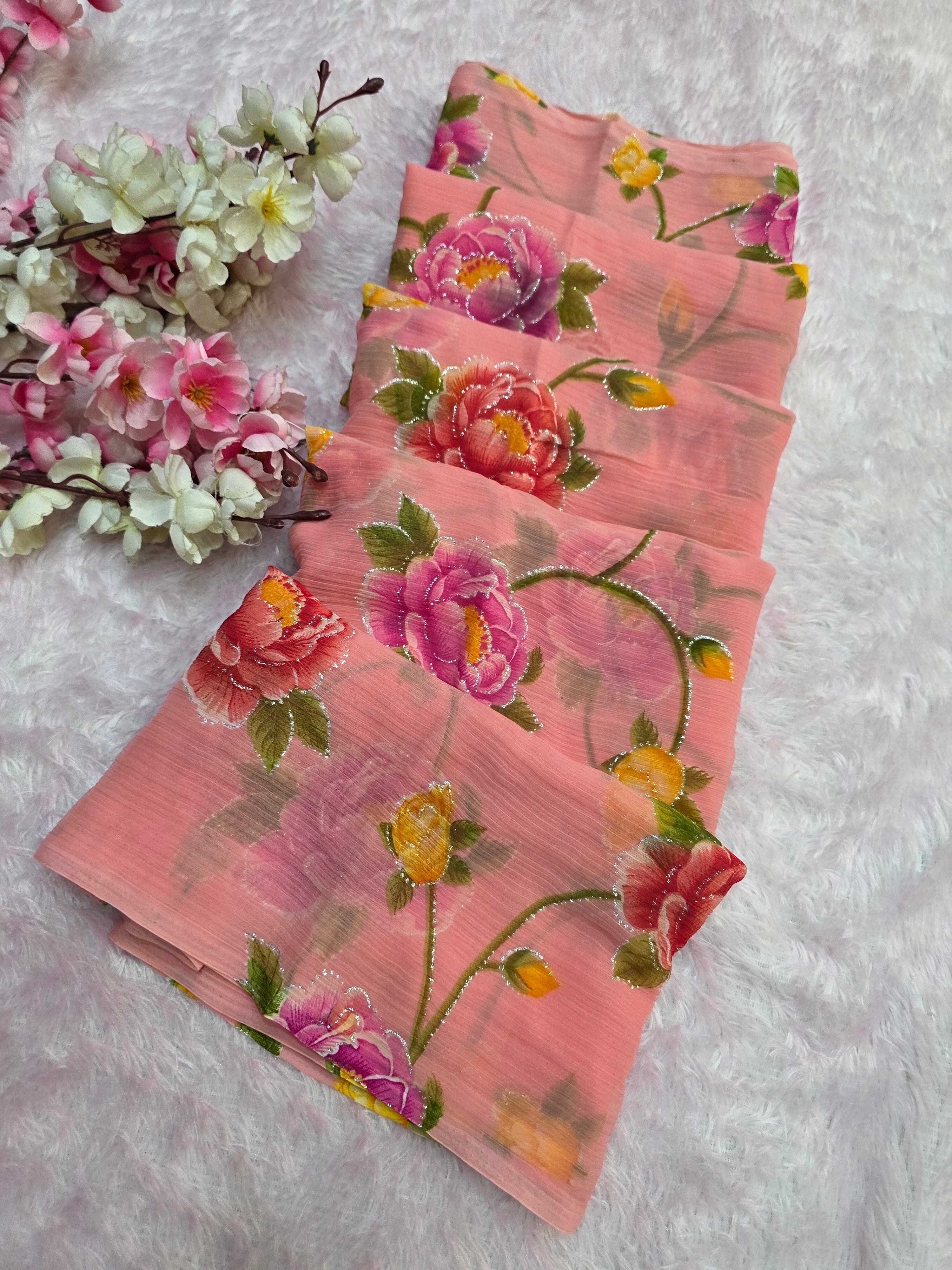 Flower Print Semi-Chiffon Saree Without Blouse – Perfect Blend of Elegance and Comfort