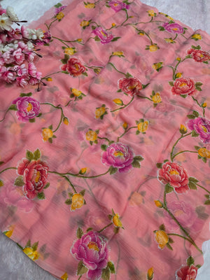 881001 Lightweight Elegant Semi Chiffon Flower Print Saree with Zari Print - Pink