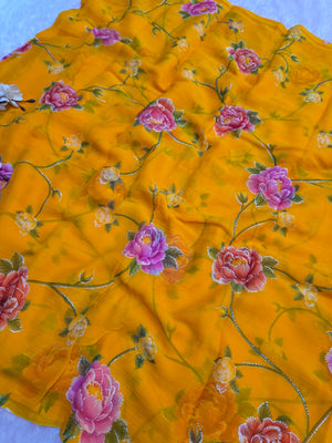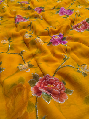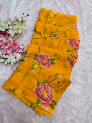 881001 Lightweight Elegant Semi Chiffon Flower Print Saree with Zari Print - Yellow