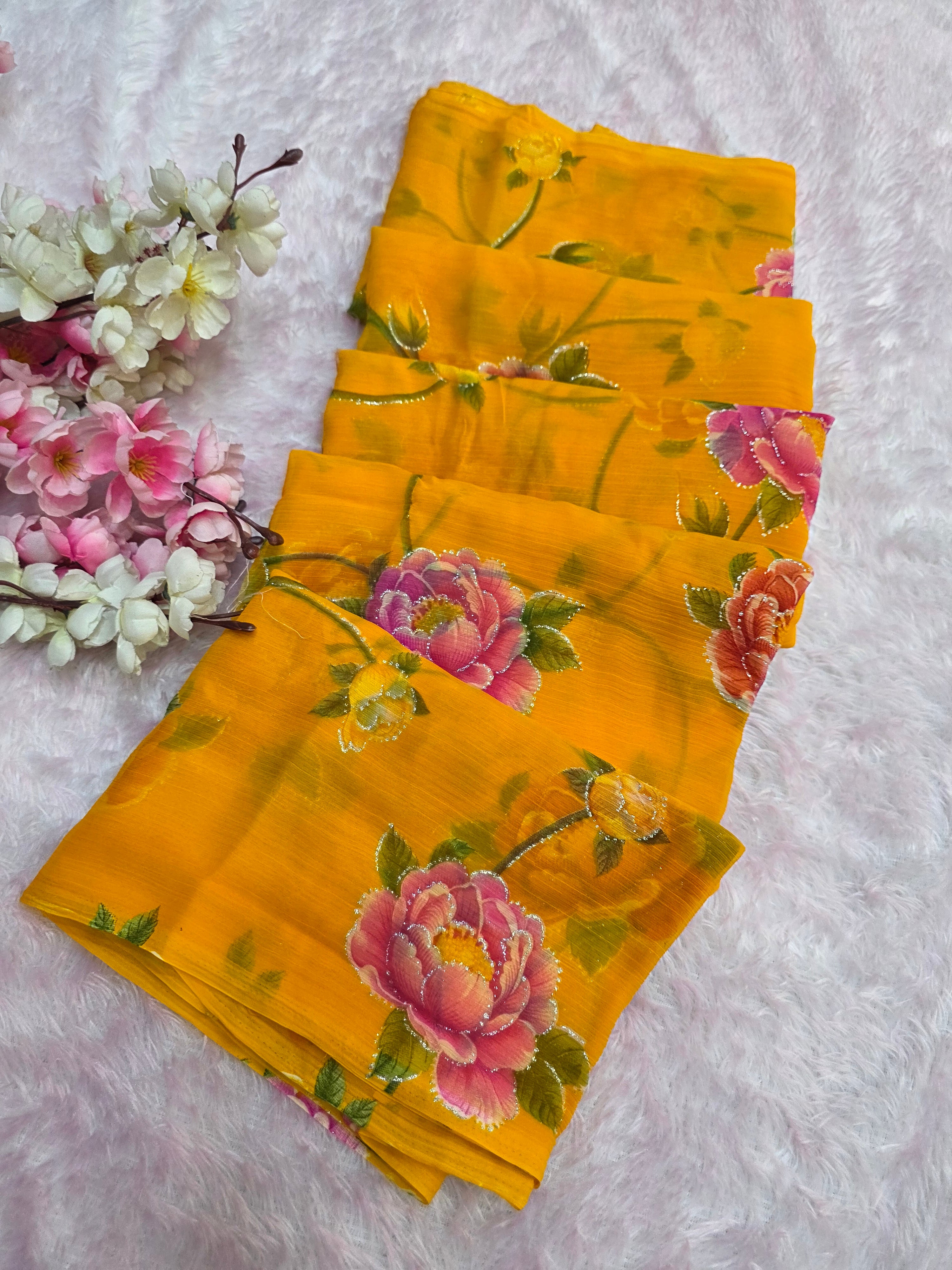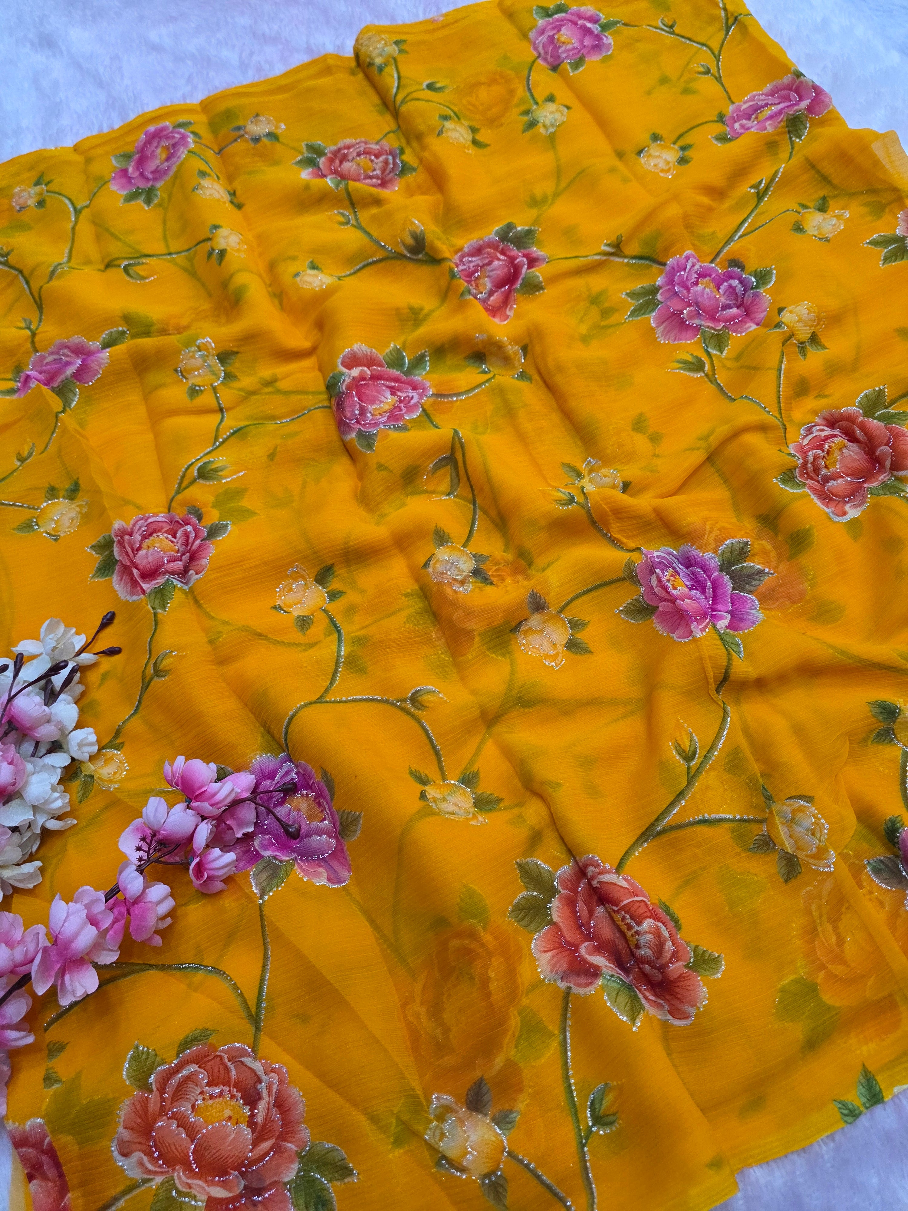 Flower Print Semi-Chiffon Saree Without Blouse – Perfect Blend of Elegance and Comfort