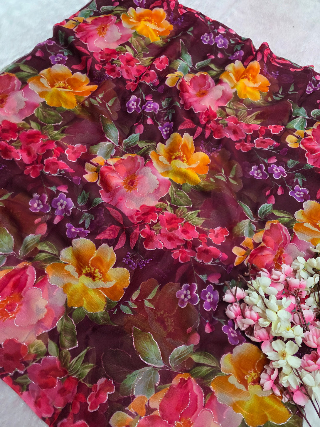 881003 Lightweight Elegant Semi Chiffon Flower Print Saree with Zari Print - Wine