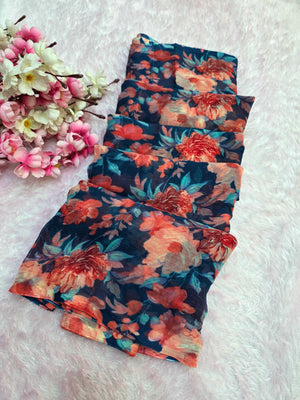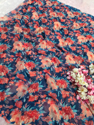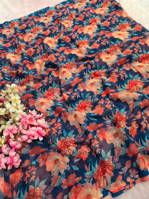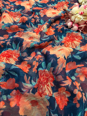 Flower Print Semi-Chiffon Saree Without Blouse – Perfect Blend of Elegance and Comfort