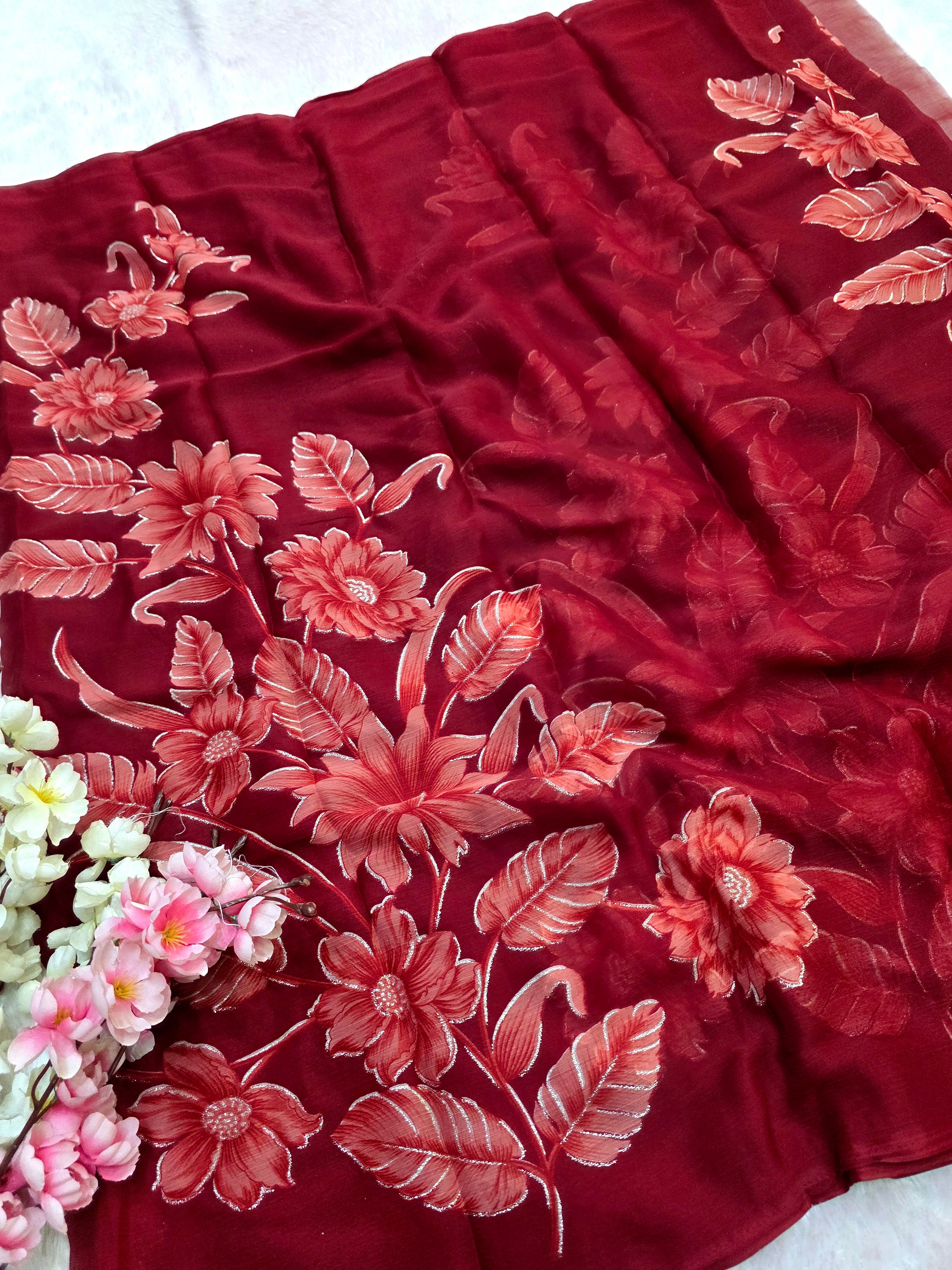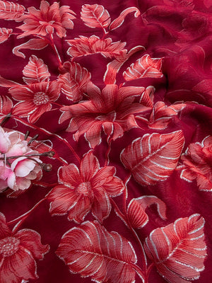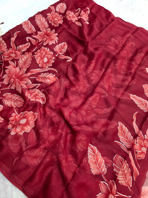 881005 Lightweight Elegant Semi Chiffon Flower Print Saree with Zari Print - Maroon