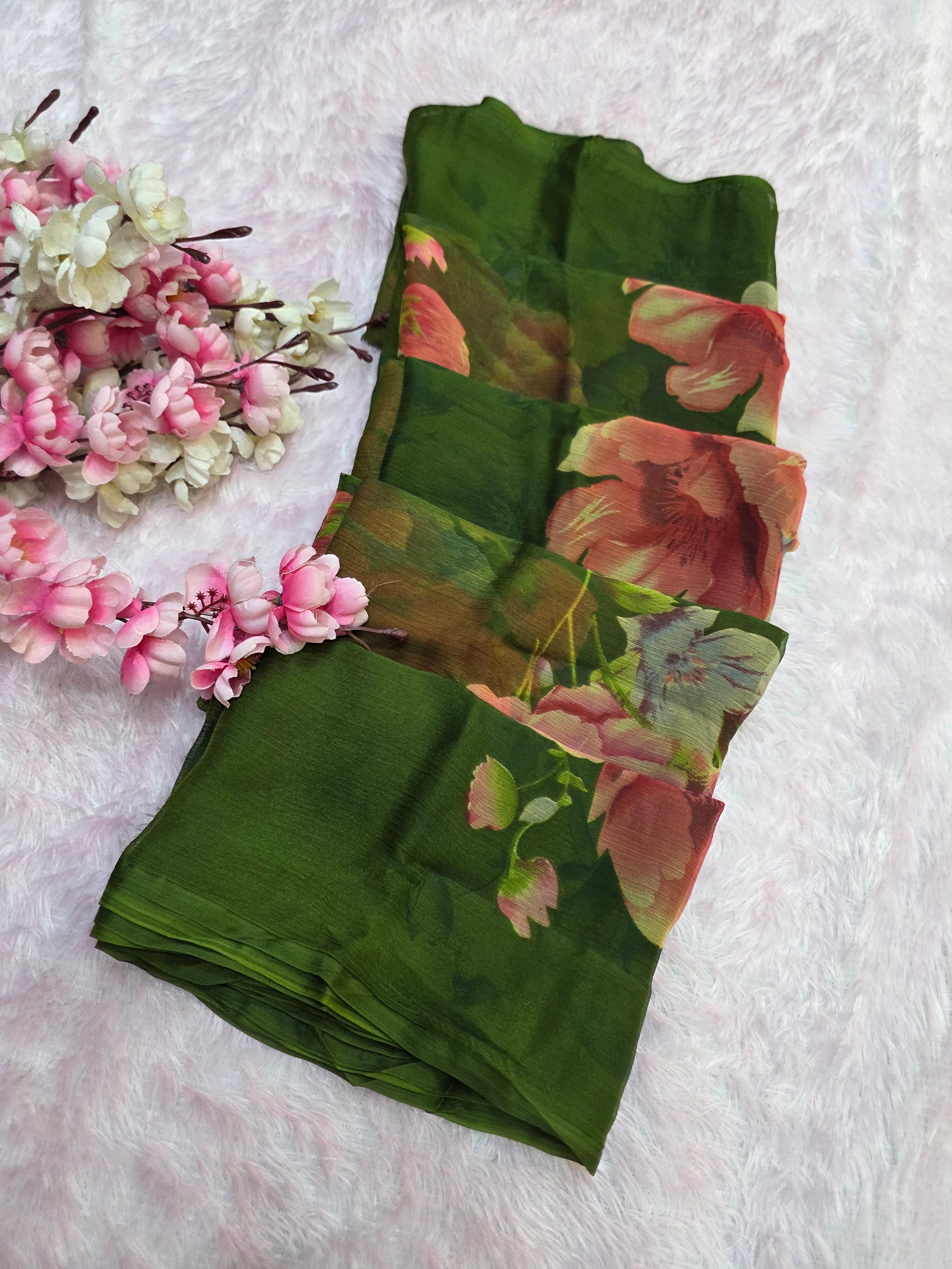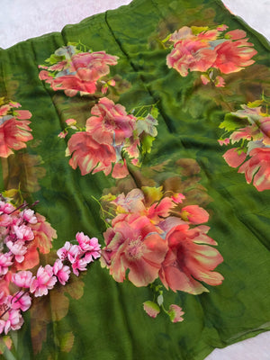 881006 Lightweight Elegant Semi Chiffon Flower Print Saree - Mehandi