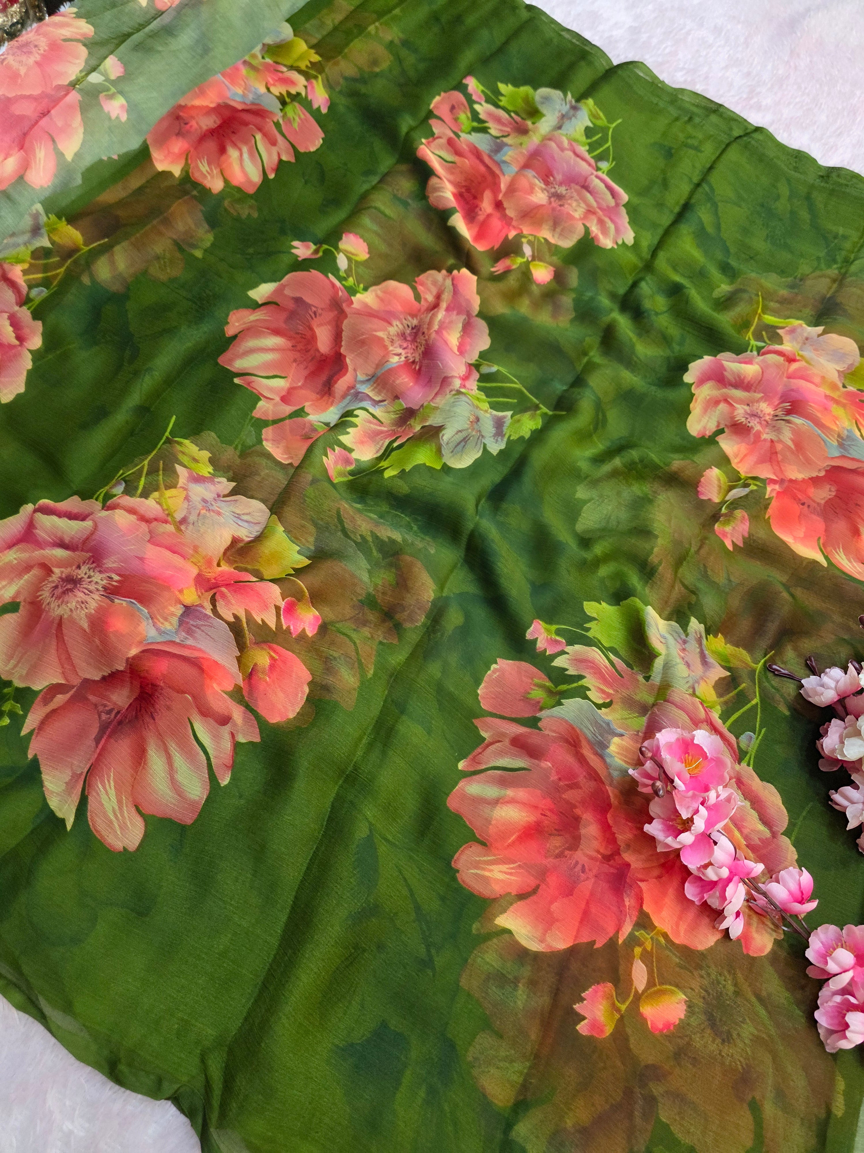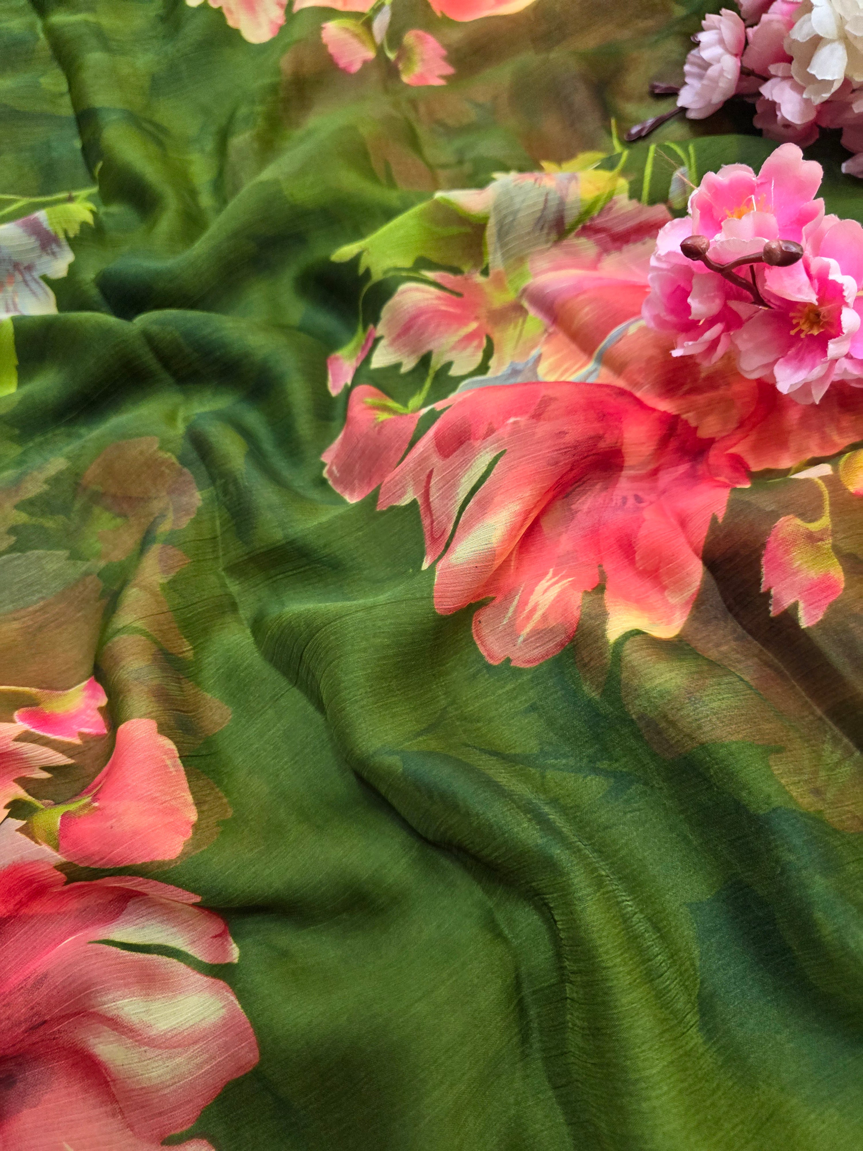 Flower Print Semi-Chiffon Saree Without Blouse – Perfect Blend of Elegance and Comfort