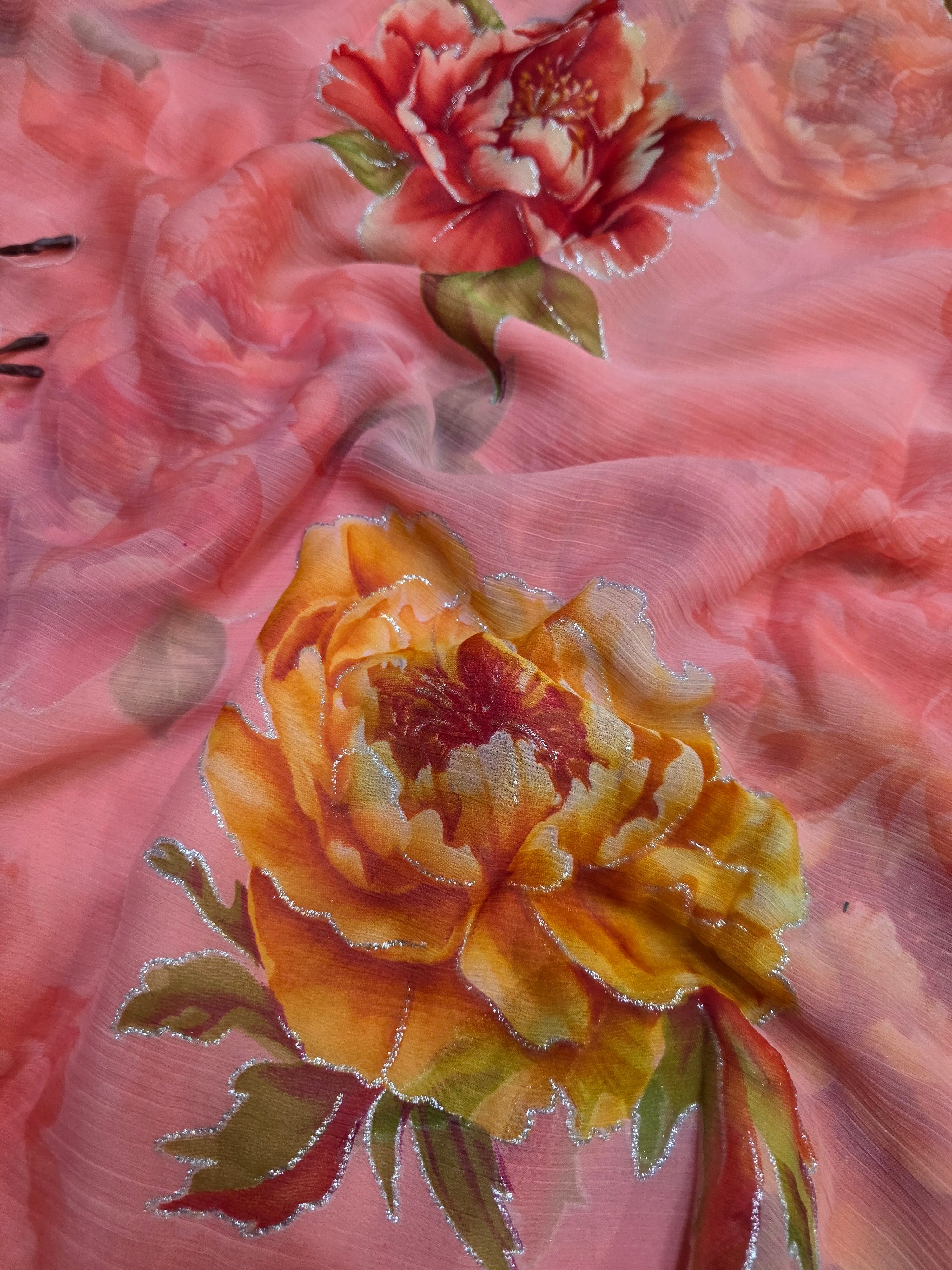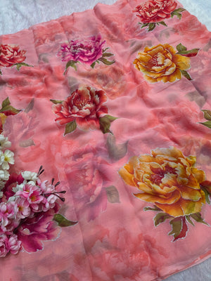 Flower Print Semi-Chiffon Saree Without Blouse – Perfect Blend of Elegance and Comfort