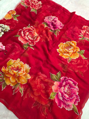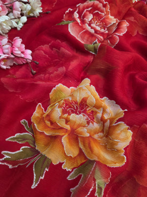 881007 Lightweight Elegant Semi Chiffon Flower Print Saree with Zari Print - Red