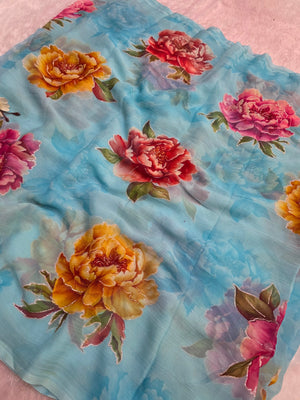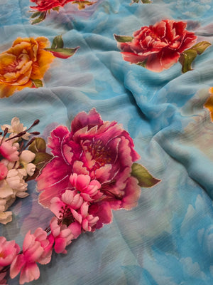 881007 Lightweight Elegant Semi Chiffon Flower Print Saree with Zari Print - Sky Blue