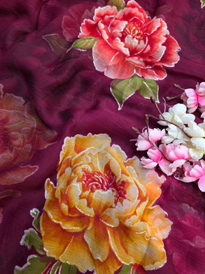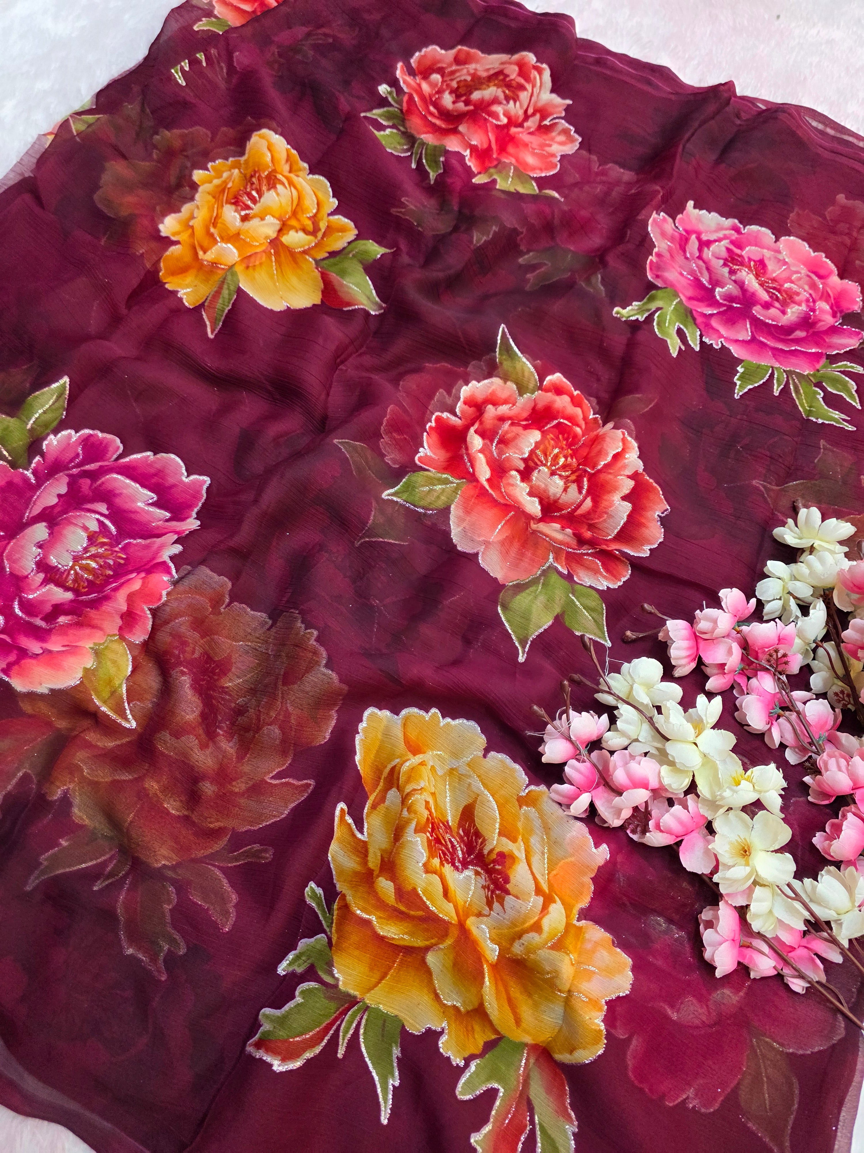 881007 Lightweight Elegant Semi Chiffon Flower Print Saree with Zari Print - Wine