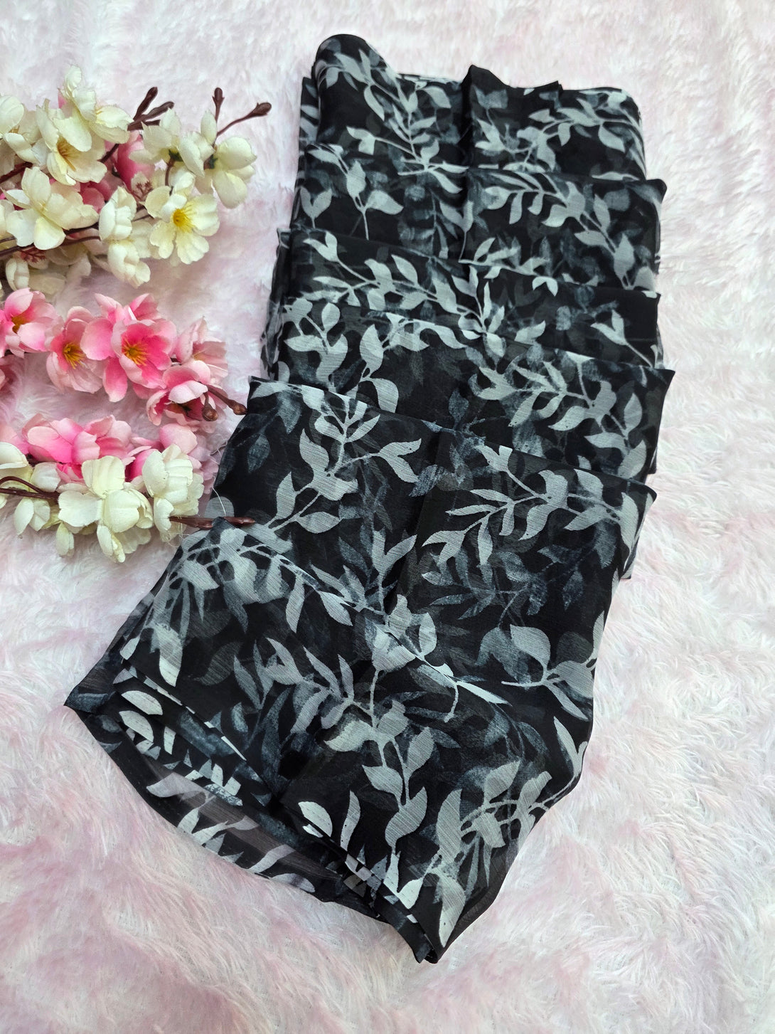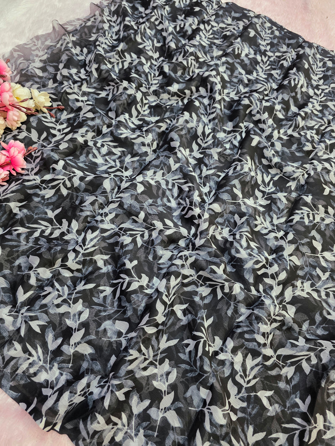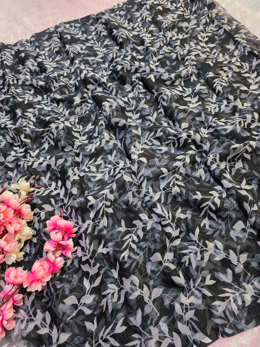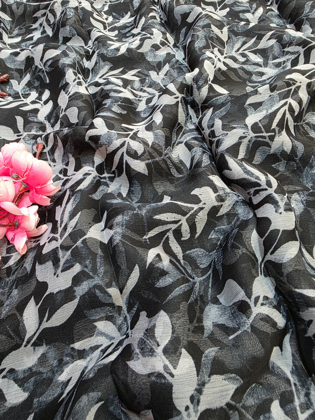 881008 Lightweight Elegant Semi Chiffon Flower Print Saree - Black